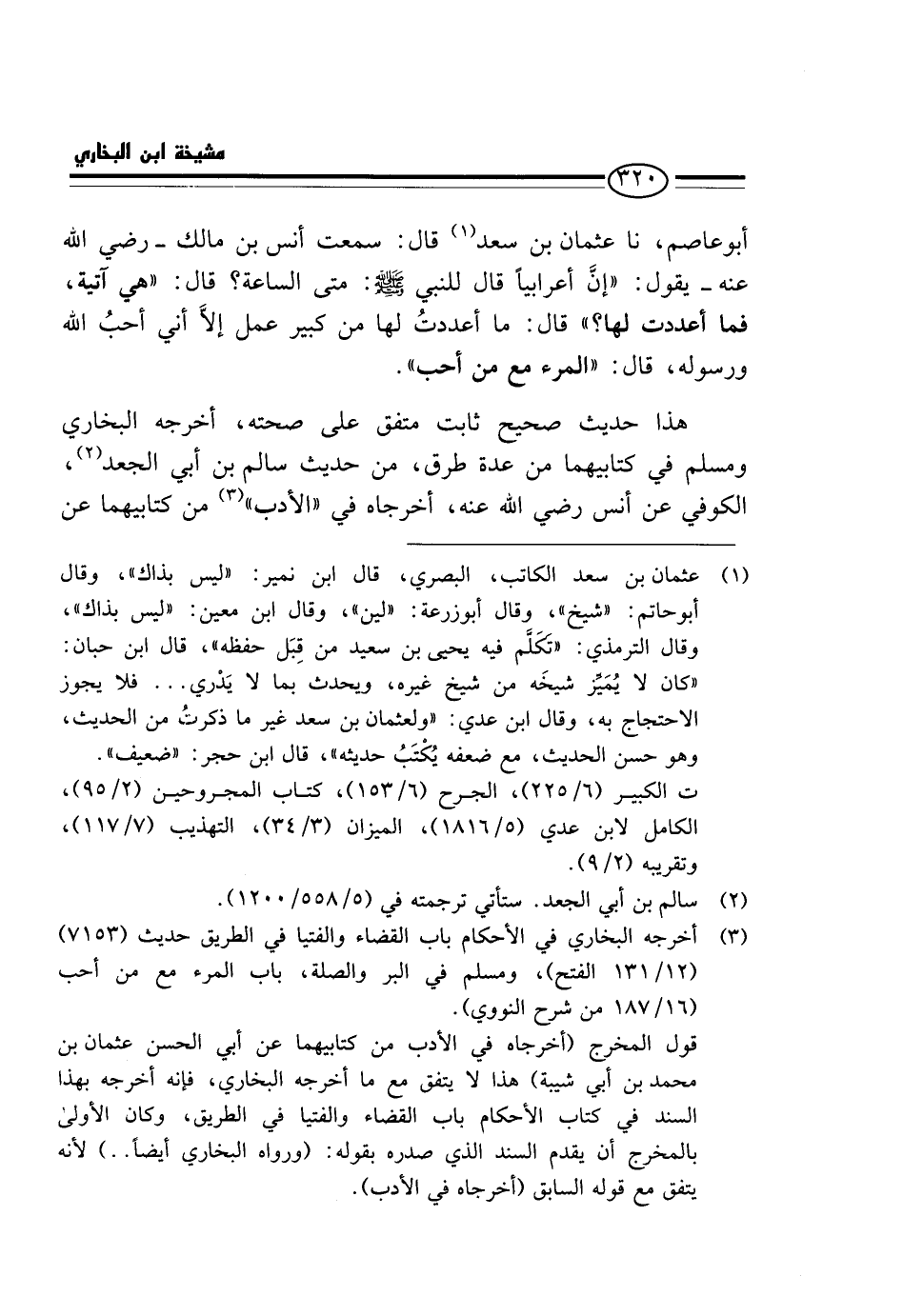أَبُو عَاصِمٍ، نَا عُثْمَانُ بْنُ سَعْدٍ، قَالَ: سَمِعْتُ أَنَسَ بْنَ مَالِكٍ - رَضِيَ اللَّهُ عَنْهُ - يَقُول: " إِن أَعْرَابِيًا قَالَ للنَّبِي - صَلَّى اللَّهُ عَلَيْهِ وَسَلَّم َ -: مَتَى السَّاعَةُ؟ قَالَ: " هِيَ آتَيِةٌ، فَمَا أَعْدَدْتَ لَهَا؟ " قَالَ: مَا أَعْدَدْتُ لَهَا مِنْ كَبِيرِ عَمَلٍ إِلَّا أَنِّي أُحِبُّ اللَّهَ وَرَسُولَهُ، قَالَ: " الْمَرْءُ مَعَ مَنْ أَحَبَّ ".