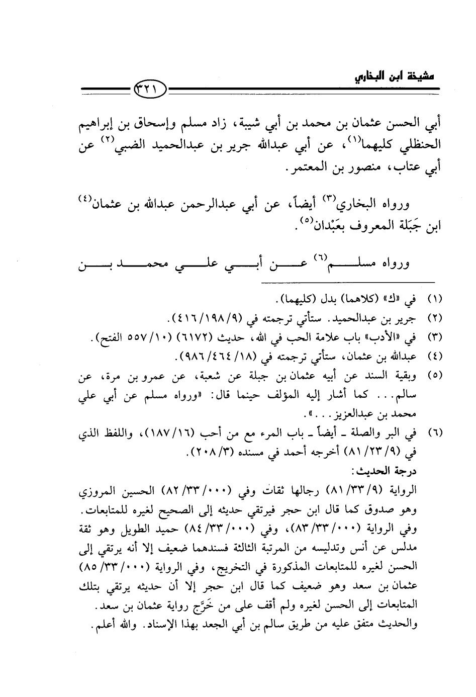 أَبِي الْحَسَنِ عُثْمَانَ بْنِ مُحَمَّدِ بْنِ أَبِي شَيْبَةَ، زَادَ مُسْلِمٌ وَإِسْحَاقَ بْنِ إِبْرَاهِيمَ الْحَنْظَلِيِّ كِلَيْهِمَا، عَنْ أَبِي عَبْدِ اللَّهِ جَرِيرِ بْنِ عَبْدِ الْحَمِيدِ الضَّبِّيِّ عَنْ أَبِي عَتَّابٍ، مَنْصُورِ بْنِ الْمُعْتَمِرِ.