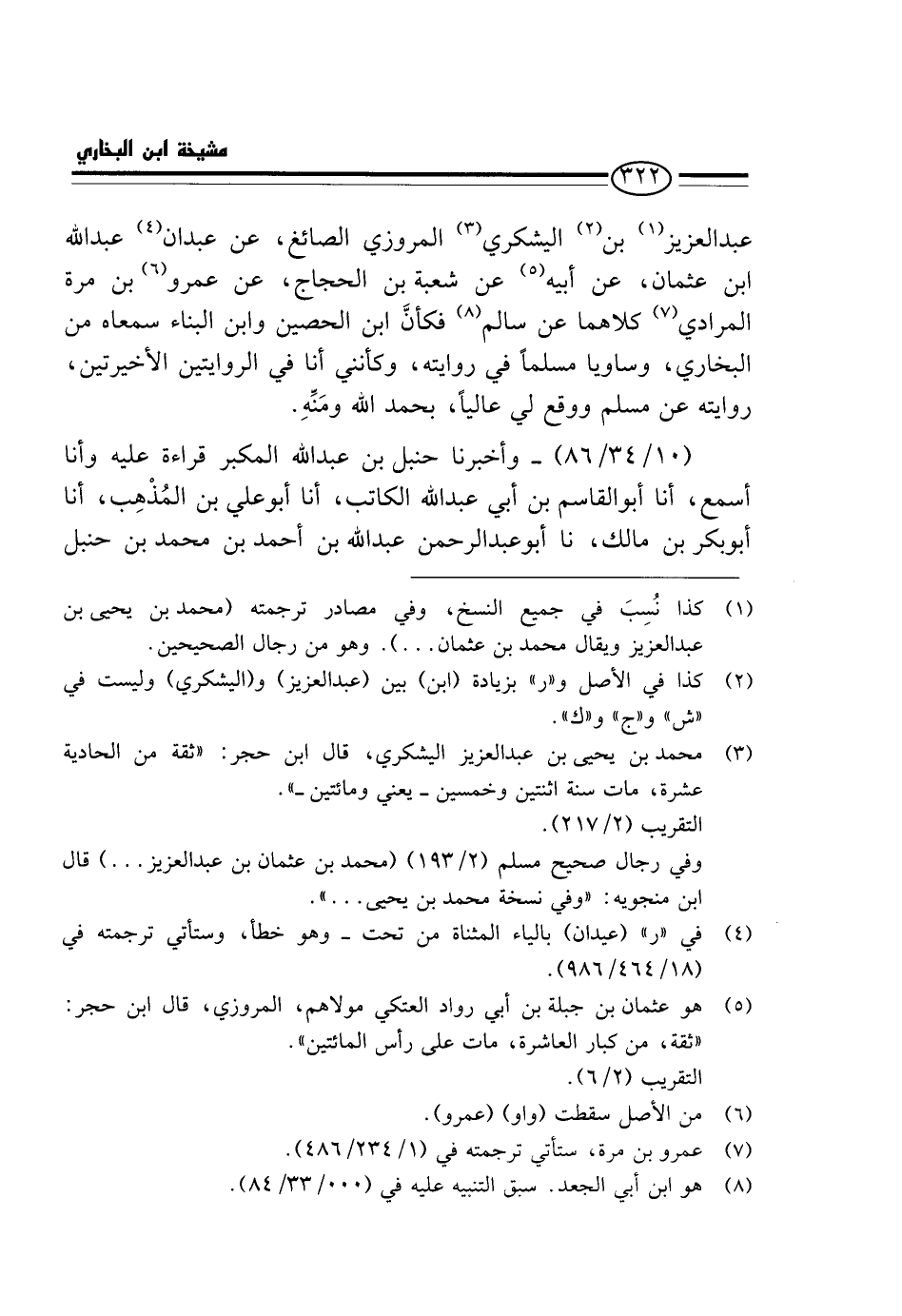 عَبْدِ الْعَزِيزِ بْنِ الْيَشْكُرِيِّ الْمَرْوَزِيِّ الصَّائِغِ، عَن عَبْدَانِ عبد الله ابْن عُثْمَانَ، عَنْ أَبِيهِ عَنْ شُعْبَةَ بْنِ الْحَجَّاجِ، عَنْ عَمْرِو بْنِ مُرَّةَ الْمُرَادِيِّ كِلَاهُمَا عَنْ سَالِمٍ فَكَأَنَّ ابْنَ الْحُصَيْنِ وَابْنَ الْبَنَّاءِ سَمِعَاهُ مِنَ الْبُخَارِيِّ، وَسَاوَيَا مُسْلِمًا فِي رِوَايَتِهِ، وَكَأَنَّنِي أَنَا فِي الرِّوَايَتَيْنِ الْأَخِيرَتَيْنِ، رِوَايَتُهُ عَنْ مُسْلِمٍ وَوَقع لي عَالِيا، بِحَمْد الله وَمِنْه.