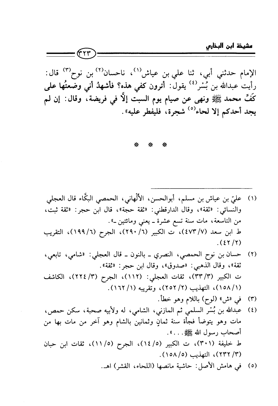 الْإِمَامُ حَدَّثَنِي أَبِي، ثَنَا عَلِيُّ بْنُ عَيَّاشٍ، نَا حَسَّانُ بْنُ نُوح قَالَ رَأَيْتُ عَبْدَ اللَّهِ بْنَ بُسْرٍ يَقُولُ: أَتَرَوْنَ كَفِّي هَذِهِ؟ فَأشْهد أَنِّي وَضَعتهَا على كف مُحَمَّد - صَلَّى اللَّهُ عَلَيْهِ وَسَلَّم َ - وَنَهَى عَنْ صِيَامِ يَوْمِ السَّبْتِ إِلَّا فِي فَرِيضَةٍ، وَقَالَ: إِنْ لَمْ يَجِدْ أَحَدُكُمْ إِلَّا لِحَاءَ شَجَرَةٍ، فَلْيُفْطِرْ عَلَيْهِ ".