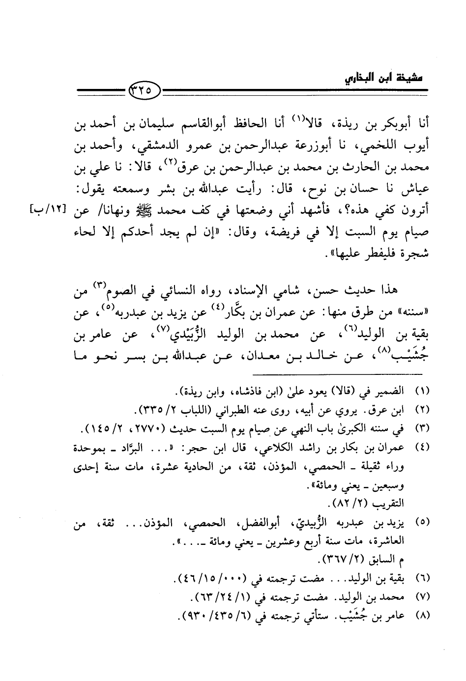 أَنَا أَبُو بَكْرِ بْنُ رَيْذَةَ، قَالَا أَنَا الْحَافِظُ أَبُو الْقَاسِمِ سُلَيْمَانُ بْنُ أَحْمَدَ بْنِ أَيُّوبَ اللَّخْمِيُّ، نَا أَبُو زُرْعَةَ عَبْدُ الرَّحْمَنِ بْنُ عَمْرٍو الدِّمَشْقِيُّ، وَأَحْمَدُ بْنُ مُحَمَّدِ بْنِ الْحَارِثِ بْنِ مُحَمَّدِ بْنِ عَبْدِ الرَّحْمَنِ بْنِ عِرْقٍ، قَالَا، نَا عَلِيُّ بْنُ عَيَّاشٍ نَا حَسَّانُ بْنُ نُوح، قَالَ: رَأَيْتُ عَبْدَ اللَّهِ بن بشر وَسَمِعْتُهُ يَقُولُ: أَتَرَوْنَ كَفِّي هَذِهِ؟ ، فَأَشْهَدُ أَنِّي وَضَعتهَا فِي كف مُحَمَّد - صَلَّى اللَّهُ عَلَيْهِ وَسَلَّم َ - وَنَهَانَا / عَنْ صِيَامِ يَوْمِ السَّبْتِ إِلَّا فِي فَرِيضَةٍ، وَقَالَ: " إِنْ لَمْ يَجِدْ أَحَدُكُمْ إِلَّا لِحَاءَ شَجَرَةٍ فَلْيُفْطِرْ عَلَيْهَا ".