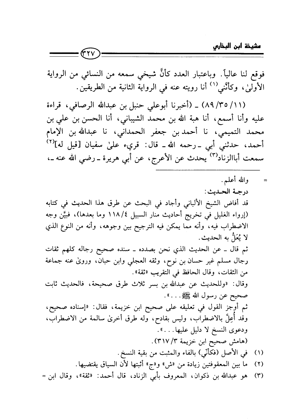 فَوَقَعَ لَنَا عَالِيًا. وَبِاعْتِبَارِ الْعَدَدِ كَأَنَّ شَيْخِي سَمِعَهُ مِنَ النَّسَائِيِّ مِنَ الرِّوَايَةِ الْأُولَى، وَكَأَنَّنِي أَنَا رَوَيْتُهُ عَنْهُ فِي الرِّوَايَةِ الثَّانِيَةِ مِنَ الطَّرِيقَيْنِ.