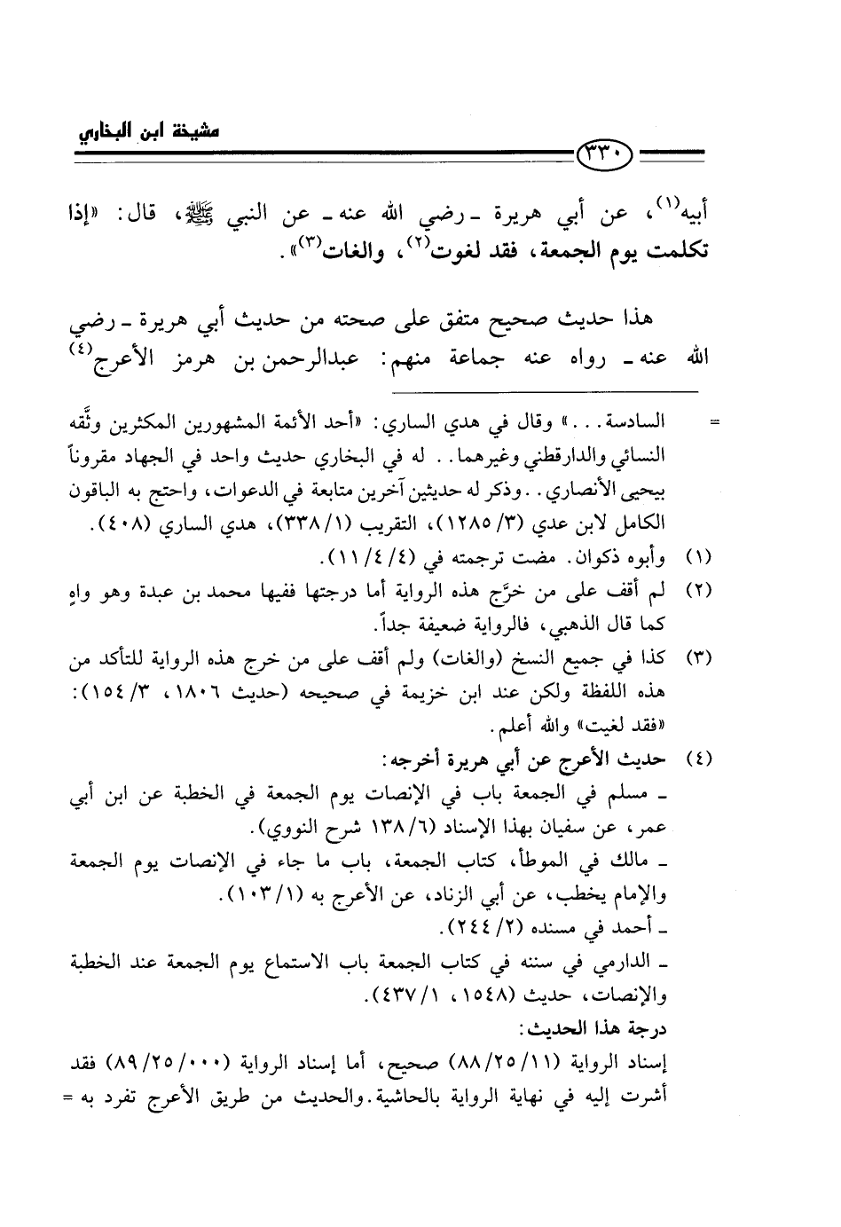 أَبِيهِ، عَنْ أَبِي هُرَيْرَةَ - رَضِيَ اللَّهُ عَنْهُ - عَن النَّبِي - صَلَّى اللَّهُ عَلَيْهِ وَسَلَّم َ -، قَالَ: " إِذَا تَكَلَّمْتَ يَوْمَ الْجُمُعَةِ، فَقَدْ لَغَوْتَ، والغات ".