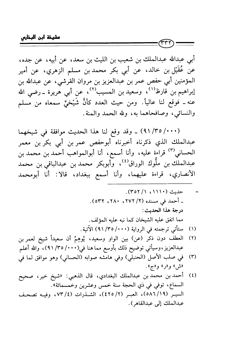 أَبِي عَبْدِ اللَّهِ عَبْدِ الْمَلِكِ بْنِ شُعَيْبِ بْنِ اللَّيْثِِ بْنِ سَعْدٍ، عَنْ أَبِيهِ، عَنْ جَدِّهِ، عَنْ عُقَيْلِ بْنِ خَالِدٍ، عَنْ أَبِي بَكْرٍ مُحَمَّدِ بْنِ مُسْلِمٍ الزُّهْرِيِّ، عَنْ أَمِيرِ الْمُؤْمِنِينَ أَبِي حَفْصٍ عُمَرَ بْنِ عَبْدِ الْعَزِيزِ بْنِ مَرْوَانَ الْقُرَشِيِّ، عَنْ عَبْدِ اللَّهِ بْنِ إِبْرَاهِيمَ بْنِ قَارِظٍ، وَسَعِيدِ بْنِ الْمُسَيِّبِ، عَنْ أَبِي هُرَيْرَةَ - رَضِيَ اللَّهُ عَنْهُ - فَوَقَعَ لَنَا عَالِيًا. وَمِنْ حَيْثُ الْعَدَدِ كَأَنَّ شَيْخِي سَمِعَاهُ مِنْ مُسْلِمٍ وَالنَّسَائِيِّ، وَصَافَحَاهُمَا بِهِ، وَلِلَّهِ الْحَمْدُ وَالْمِنَّةُ.