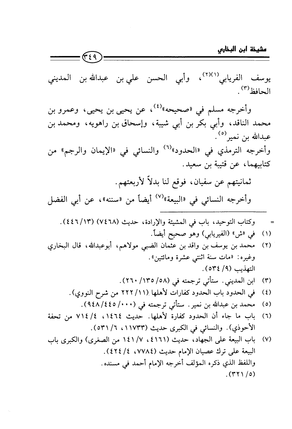 يُوسُفَ الْفِرْيَابِيِّ، وَأَبِي الْحَسَنِ عَلِيِّ بْنِ عَبْدِ اللَّهِ بْنِ الْمَدِينِيِّ الْحَافِظِ.