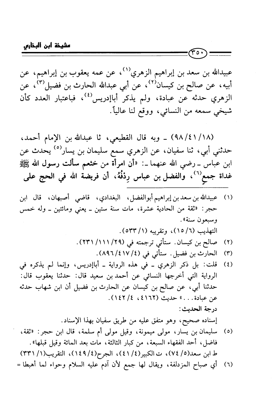 (18 / 41 / 98) - وَبِه قَالَ الْقطيعِي، ثا عبد الله بن الْإِمَامِ أَحْمَدَ، حَدَّثَنِي أَبِي، ثَنَا سُفْيَانُ، عَنِ الزُّهْرِيِّ سَمِعَ سُلَيْمَانَ بْنَ يَسَارٍ يُحَدِّثُ عَنِ ابْنِ عَبَّاسٍ - رَضِيَ اللَّهُ عَنْهُمَا -: " أَنَّ امْرَأَةً من خثعم سَأَلت رَسُول الله - صَلَّى اللَّهُ عَلَيْهِ وَسَلَّم َ - غَدَاةَ جَمْعٍ وَالْفَضْلُ بْنُ عَبَّاسٍ رِدْفُهُ، أَنَّ فَرِيضَةَ اللَّهِ فِي الْحَجِّ عَلَى