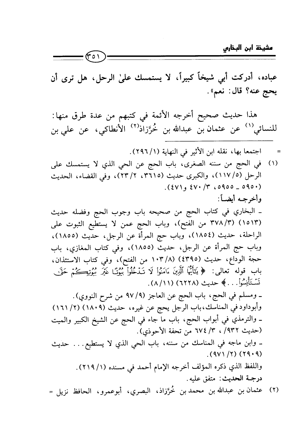 عِبَادِهِ، أَدْرَكَتْ أَبِي شَيْخًا كَبِيرًا، لَا يَسْتَمْسِكُ عَلَى الرَّحْلِ، هَلْ تَرَى أَنَّ يُحَجَّ عَنْهُ؟ قَالَ: نَعَمْ ".
