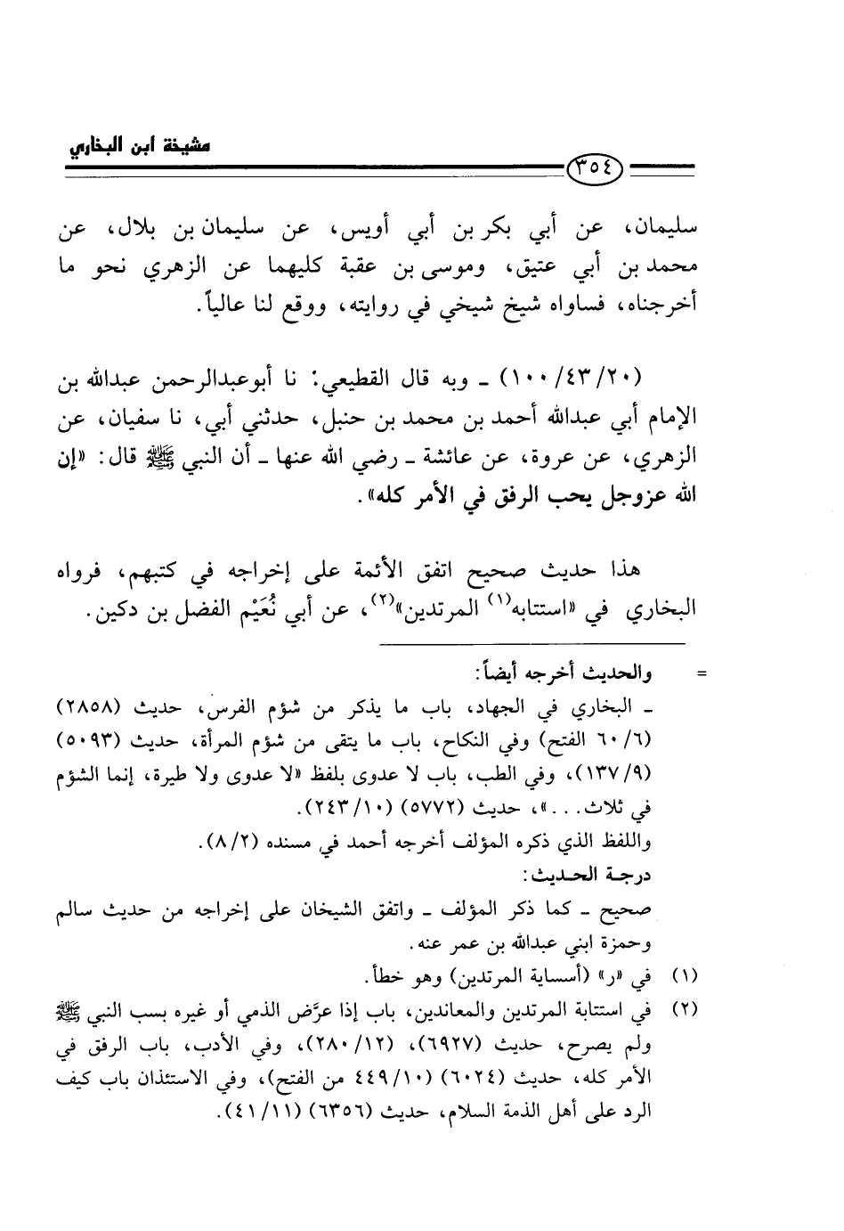 (20 / 43 / 100) - وَبِهِ قَالَ الْقَطِيعِيُّ: نَا أَبُو عَبْدِ الرَّحْمَن عبد الله بن الْإِمَامِ أَبِي عَبْدِ اللَّهِ أَحْمَدَ بْنِ مُحَمَّدِ بْنِ حَنْبَلٍ، حَدَّثَنِي أَبِي، نَا سُفْيَانُ، عَنِ الزُّهْرِيِّ، عَنْ عُرْوَةَ، عَنْ عَائِشَةَ - رَضِيَ اللَّهُ عَنْهَا - أَن النَّبِي - صَلَّى اللَّهُ عَلَيْهِ وَسَلَّم َ - قَالَ: " إِنَّ اللَّهَ عَزَّ وَجَلَّ يُحِبُّ الرِّفْقَ فِي الْأَمْرِ كُلِّهِ ".