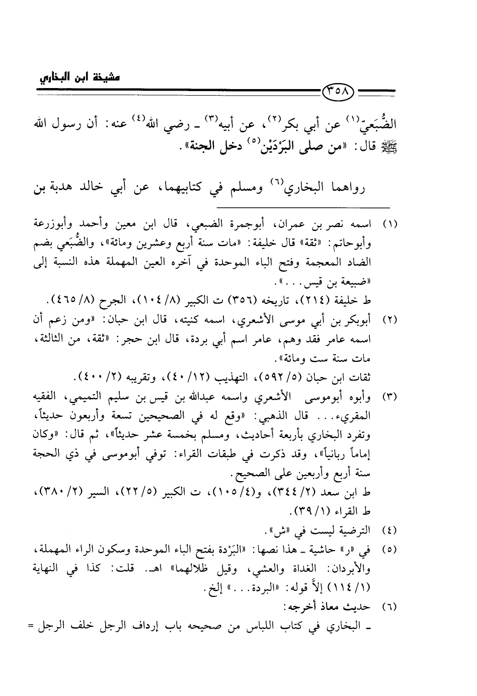 الضُّبَعِيُّ عَنْ أَبِي بَكْرٍ، عَنْ أَبِيهِ - رَضِيَ الله عَنهُ: أَن رَسُول الله - صَلَّى اللَّهُ عَلَيْهِ وَسَلَّم َ - قَالَ: " مَنْ صَلَّى الْبَرْدَيْنِ دَخَلَ الْجَنَّةَ ".