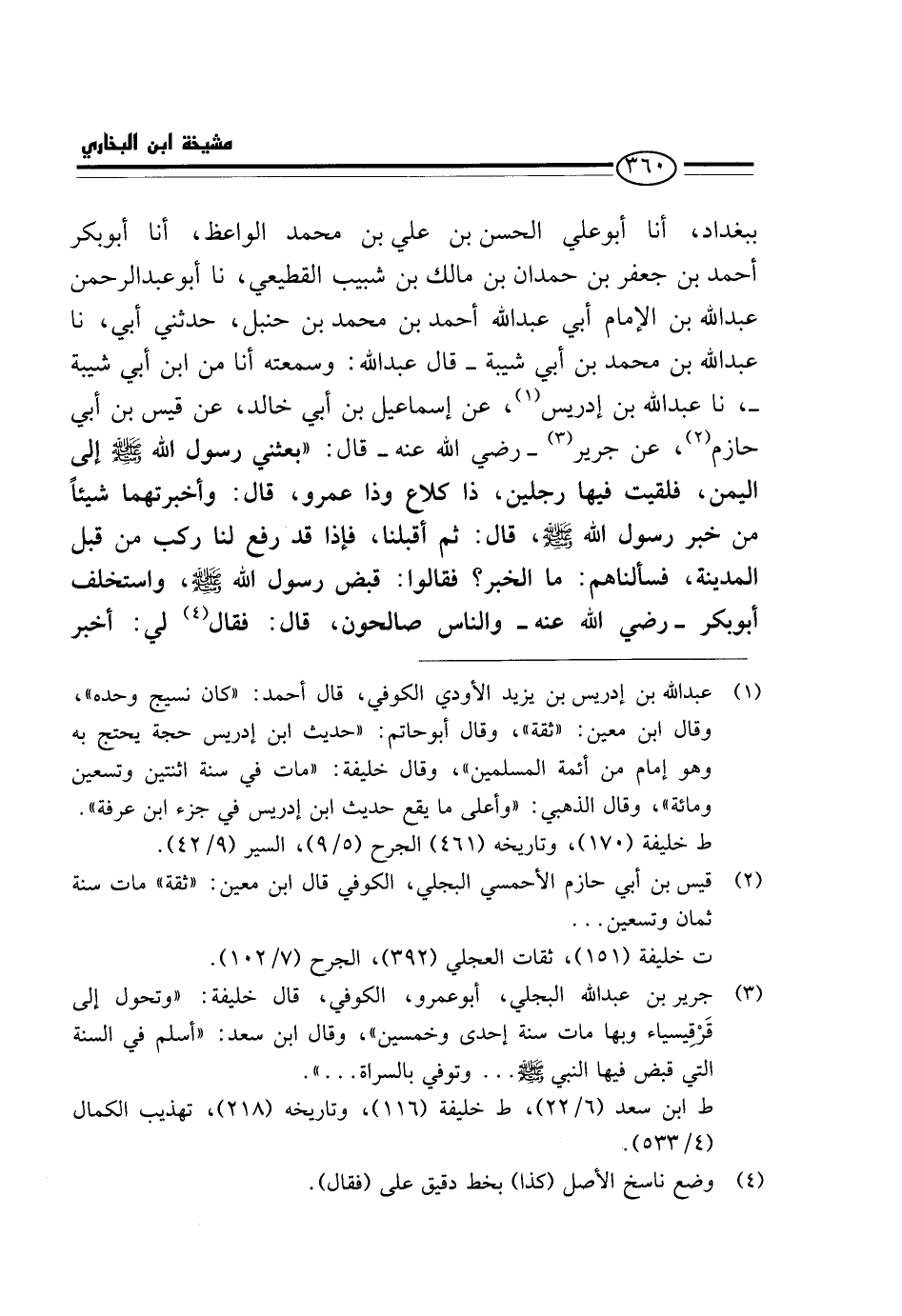 بِبَغْدَادَ، أَنَا أَبُو عَلِيٍّ الْحَسَنُ بْنُ عَلِيِّ بْنِ مُحَمَّدٍ الْوَاعِظُ، أَنَا أَبُو بَكْرٍ أَحْمَدُ بْنُ جَعْفَرِ بْنِ حَمْدَانَ بْنِ مَالِكِ بْنِ شَبِيبٍ الْقَطِيعِيُّ، نَا أَبُو عَبْدِ الرَّحْمَنِ عَبْدُ الله بن الْإِمَامِ أَبِي عَبْدِ اللَّهِ أَحْمَدَ بْنِ مُحَمَّدِ بْنِ حَنْبَلٍ، حَدَّثَنِي أَبِي، نَا عَبْدُ اللَّهِ بْنُ مُحَمَّدِ بْنِ أَبِي شَيْبَةَ - قَالَ عَبْدُ اللَّهِ: وَسَمِعْتُهُ أَنَا مِنْ ابْنِ أَبِي شَيْبَةَ -، نَا عَبْدُ اللَّهِ بْنُ إِدْرِيسَ، عَنْ إِسْمَاعِيلَ بْنِ أَبِي خَالِدٍ، عَنْ قَيْسِ بْنِ أَبِي حَازِمٍ، عَنْ جَرِيرٍ - رَضِيَ اللَّهُ عَنْهُ - قَالَ: " بَعَثَنِي رَسُول الله - صَلَّى اللَّهُ عَلَيْهِ وَسَلَّم َ - إِلَى الْيَمَنِ، فَلَقِيتُ فِيهَا رَجُلَيْنِ، ذَا كُلَاعٍ وَذَا عَمْرٍو، قَالَ: وَأَخْبَرْتُهُمَا شَيْئًا مِنْ خَبَرِ رَسُول الله - صَلَّى اللَّهُ عَلَيْهِ وَسَلَّم َ -، قَالَ: ثُمَّ أَقْبَلْنَا، فَإِذَا قَدْ رُفِعَ لَنَا رَكْبٌ مِنْ قِبَلِ الْمَدِينَةِ، فَسَأَلْنَاهُمْ: مَا الْخَبَرُ؟ فَقَالُوا: قبض رَسُول الله - صَلَّى اللَّهُ عَلَيْهِ وَسَلَّم َ -، وَاسْتُخْلِفَ أَبُو بَكْرٍ - رَضِيَ اللَّهُ عَنْهُ - وَالنَّاسُ صَالِحُونَ، قَالَ: فَقَالَ لِي: أَخْبِرْ