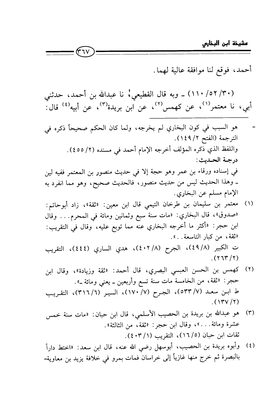 (30 / 52 / 110) - وَبِهِ قَالَ الْقَطِيعِيُّ: نَا عَبْدُ اللَّهِ بْنُ أَحْمَدَ، حَدَّثَنِي أَبِي، نَا مُعْتَمِرٌ، عَنْ كَهْمَسٍ، عَنِ ابْنِ بُرَيْدَةَ، عَنْ أَبِيهِ قَالَ: