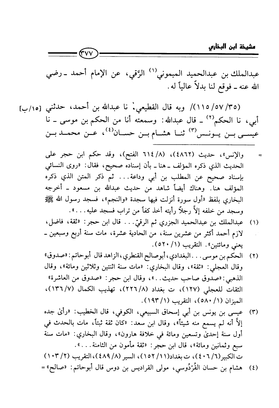 (35 / 57 / 115) - / وَبِهِ قَالَ الْقَطِيعِيُّ: نَا عَبْدُ اللَّهِ بْنُ أَحْمَدَ، حَدَّثَنِي أَبِي، نَا الْحَكَمُ - قَالَ عَبْدُ اللَّهِ / وَسَمِعْتُهُ أَنَا مِنَ الْحَكَمِ بْنِ مُوسَى - نَا عِيسَى بْنُ يُونُسَ ثَنَا هِشَامُ بْنُ حَسَّانٍ، عَنْ مُحَمَّدِ بن