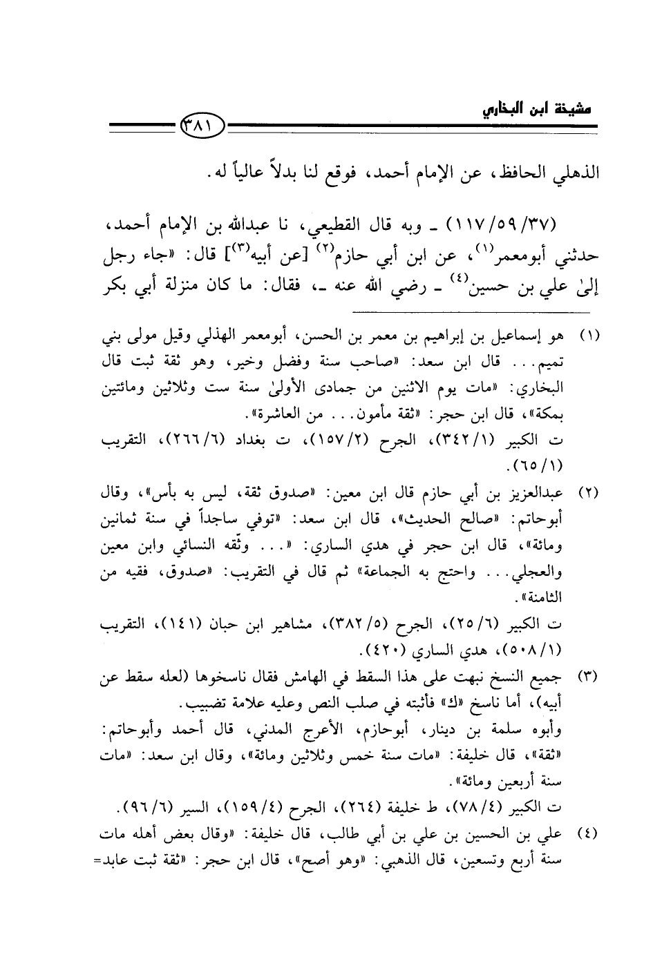 (37 / 59 / 117) - وَبِهِ قَالَ الْقَطِيعِيُّ، نَا عبد الله بن الْإِمَامِ أَحْمَدَ، حَدَّثَنِي أَبُو مَعْمَرٍ، عَنِ ابْنِ أَبِي حَازِمٍ [عَنْ أَبِيهِ] قَالَ: " جَاءَ رَجُلٌ إِلَى عَلِيِّ بْنِ حُسَيْنٍ - رَضِيَ اللَّهُ عَنْهُ -، فَقَالَ: مَا كَانَ مَنْزِلَةُ أَبِي بَكْرٍ