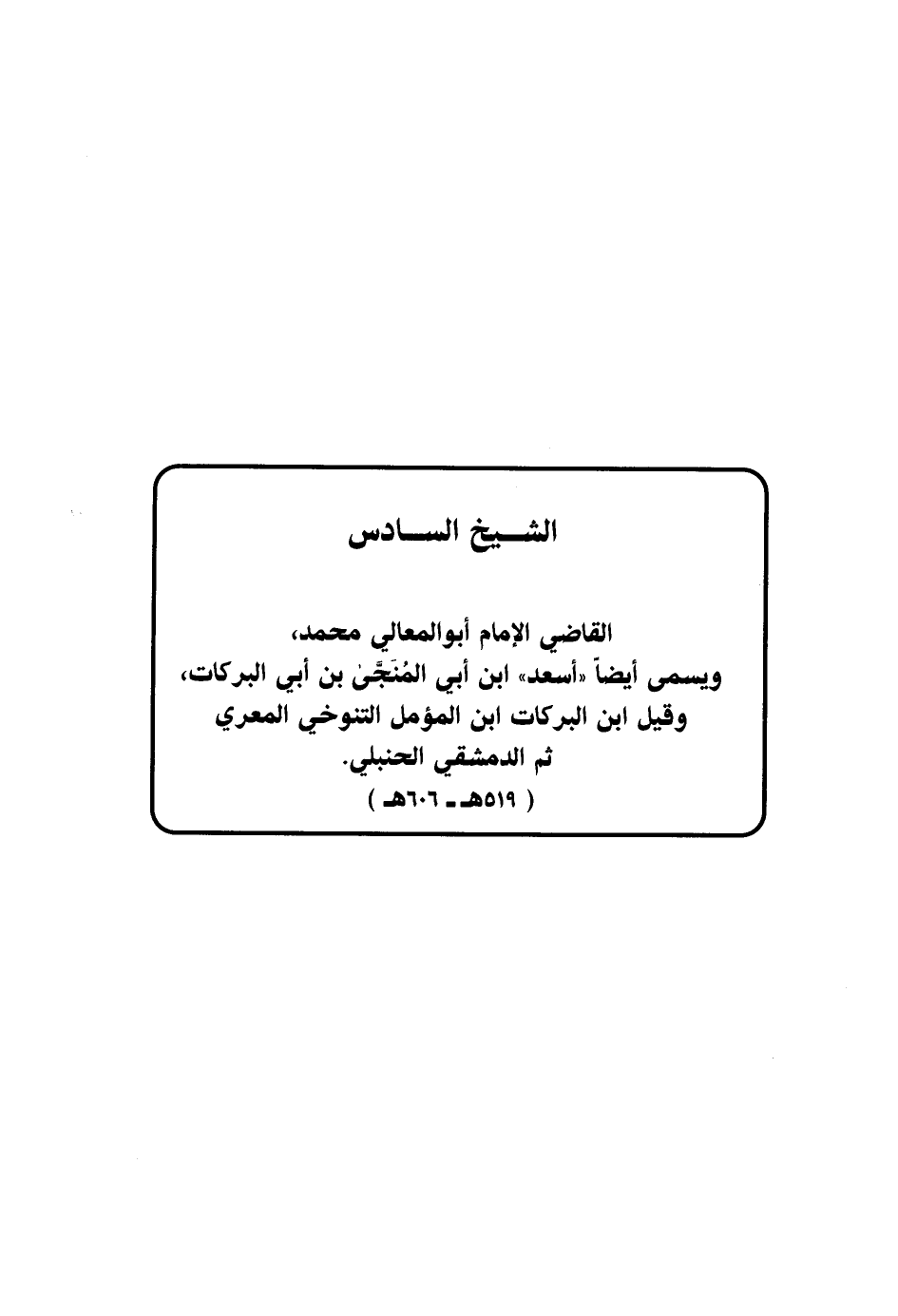 (الشَّيْخُ السَّادِسُ الْقَاضِي الْإِمَامُ أَبُو الْمَعَالِي مُحَمَّدٌ، وَيُسَمَّى أَيْضًا " أَسْعَدُ " ابْنُ أَبِي الْمُنَجَّى بْنِ أبي البركات وَقيل ابْن البركات ابْن الْمُؤَمَّلِ التَّنُوخِيُّ الْمَعَرِّيُّ ثُمَّ الدِّمَشْقِيُّ الْحَنْبَلِيُّ. (519 هـ - 606 هـ))