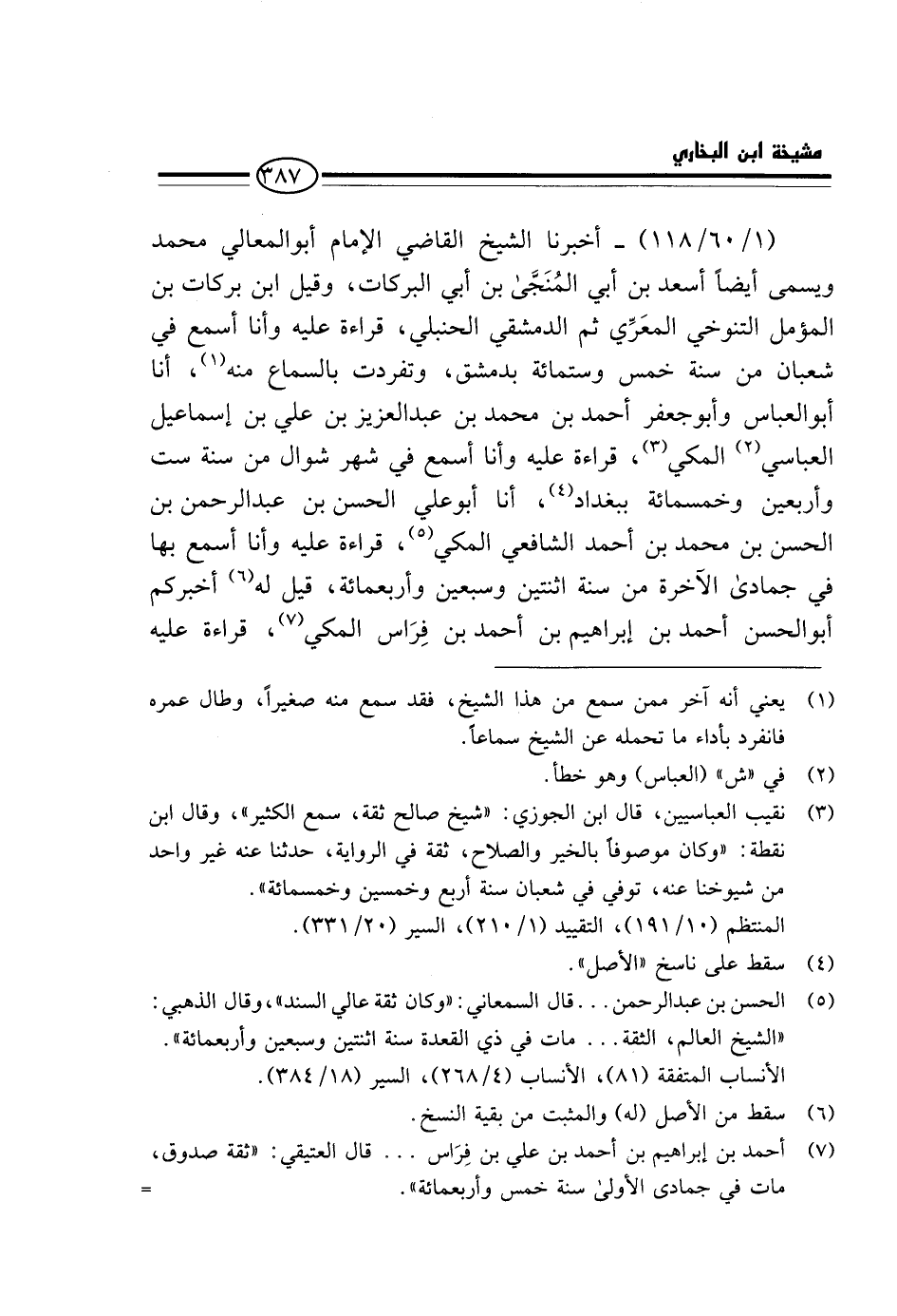 (1 / 60 / 118) - أَخْبَرَنَا الشَّيْخُ الْقَاضِي الْإِمَامُ أَبُو الْمَعَالِي مُحَمَّدُ وَيُسَمَّى أَيْضًا أَسْعَدُ بْنُ أَبِي الْمُنَجَّى بْنِ أَبِي الْبَرَكَاتِ، وَقِيلَ ابْنُ بَرَكَاتِ بْنِ الْمُؤَمَّلِ التَّنُوخِيُّ الْمَعَرِّيُّ ثُمَّ الدِّمَشْقِيُّ الْحَنْبَلِيُّ، قِرَاءَةً عَلَيْهِ وَأَنَا أَسْمَعُ فِي شَعْبَانَ مِنْ سَنَةِ خَمْسٍ وسِتمِائَة بِدِمَشْقَ، وَتَفَرَّدْتُ بِالسَّمَاعِ مِنْهُ، أَنَا أَبُو الْعَبَّاسِ وَأَبُو جَعْفَرٍ أَحْمَدُ بْنُ مُحَمَّدِ بْنِ عَبْدِ الْعَزِيزِ بْنِ عَلِيِّ بْنِ إِسْمَاعِيلَ الْعَبَّاسِيُّ الْمَكِّيُّ، قِرَاءَةً عَلَيْهِ وَأَنَا أَسْمَعُ فِي شَهْرِ شَوَّالٍ من سنة سِتّ وَأَرْبَعين وَخَمْسمِائة بِبَغْدَادَ، أَنَا أَبُو عَلِيٍّ الْحَسَنُ بْنُ عَبْدِ الرَّحْمَنِ بْنِ الْحَسَنِ بْنِ مُحَمَّدِ بْنِ أَحْمَدَ الشَّافِعِيُّ الْمَكِّيُّ، قِرَاءَةً عَلَيْهِ وَأَنَا أَسْمَعُ بِهَا فِي جُمَادَى الْآخِرَةِ مِنْ سَنَةِ اثْنَتَيْنِ وَسَبْعِينَ وَأَرْبَعمِائَة، قِيلَ لَهُ أَخْبَرَكُمْ أَبُو الْحَسَنِ أَحْمَدُ بْنُ إِبْرَاهِيمَ بْنِ أَحْمَدَ بْنِ فِرَاسٍ الْمَكِّيُّ، قِرَاءَةً عَلَيْهِ