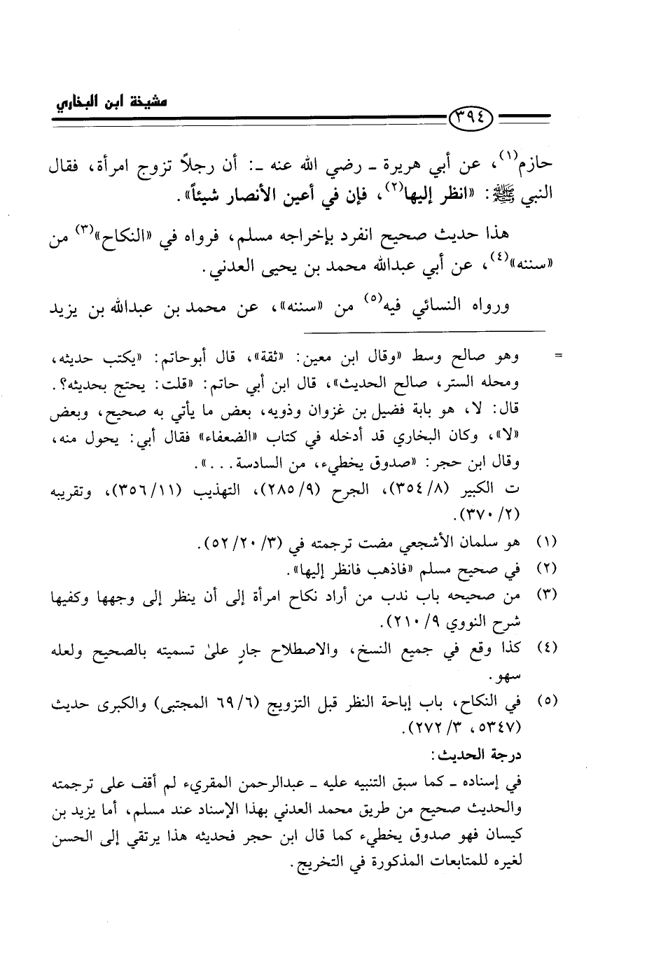 حَازِمٍ، عَنْ أَبِي هُرَيْرَةَ - رَضِيَ اللَّهُ عَنْهُ: - أَن رجلا تزوج امْرَأَة، فَقَالَ النَّبِي - صَلَّى اللَّهُ عَلَيْهِ وَسَلَّم َ -: " انْظُرْ إِلَيْهَا، فَإِنَّ فِي أَعْيُنِ الْأَنْصَارِ شَيْئًا ".