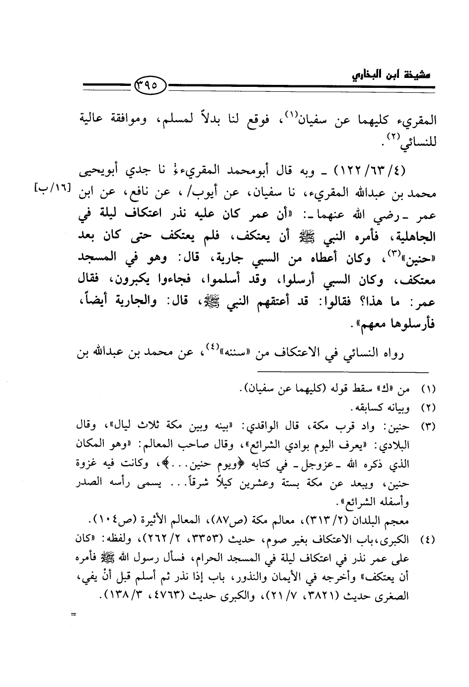 (4 / 63 / 122) - وَبِهِ قَالَ أَبُو مُحَمَّدٍ المقريء: نَا جَدِّي أَبُو يَحْيَى مُحَمَّدُ بْنُ عَبْدِ الله المقريء، نَا سُفْيَانُ، عَنْ أَيُّوبَ /، عَنْ نَافِعٍ، عَنِ ابْنِ عُمَرَ - رَضِيَ اللَّهُ عَنْهُمَا -: " أَنَّ عُمَرَ كَانَ عَلَيْهِ نَذْرُ اعْتِكَافِ لَيْلَةٍ فِي الْجَاهِلِيَّةِ، فَأمره النَّبِي - صَلَّى اللَّهُ عَلَيْهِ وَسَلَّم َ - أَنْ يَعْتَكِفَ، فَلَمْ يَعْتَكِفْ حَتَّى كَانَ بَعْدَ " حُنَيْنٍ "، وَكَانَ أَعْطَاهُ مِنَ السَّبْيِّ جَارِيَةً، قَالَ: وَهُوَ فِي الْمَسْجِدِ مُعْتَكِفٌ، وَكَانَ السَّبْيُّ أُرْسِلُوا، وَقَدْ أَسْلَمُوا، فَجَاءُوا يُكَبِّرُونَ، فَقَالَ عُمَرُ: مَا هَذَا؟ فَقَالُوا: قد أعتقهم النَّبِي - صَلَّى اللَّهُ عَلَيْهِ وَسَلَّم َ -، قَالَ: وَالْجَارِيَةُ أَيْضًا، فَأَرْسَلُوهَا مَعَهُمْ ".