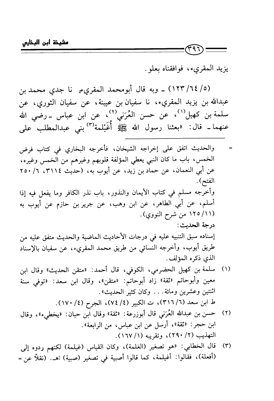(5 / 64 / 123) - وَبِه قَالَ أَبُو مُحَمَّد المقريء: نَا جَدِّي مُحَمَّدُ بْنُ عَبْدِ اللَّهِ بْنِ يزِيد المقريء، نَا سُفْيَانُ بْنُ عُيَيْنَةَ، عَنْ سُفْيَانَ الثَّوْرِيِّ، عَنْ سَلَمَةَ بْنِ كُهَيْلٍ، عَنْ حَسَنٍ الْعُرَنِيِّ، عَنِ ابْنِ عَبَّاسٍ - رَضِيَ اللَّهُ عَنْهُمَا - قَالَ: " بعثنَا رَسُول الله - صَلَّى اللَّهُ عَلَيْهِ وَسَلَّم َ - أُغَيْلِمَةَ بَنِي عَبْدِ الْمُطَّلِبِ عَلَى