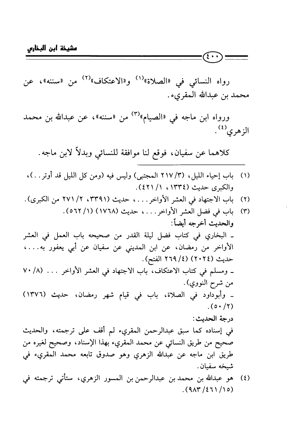 كِلَاهُمَا عَنْ سُفْيَانَ، فَوَقَعَ لَنَا مُوَافَقَةً لِلنَّسَائِيِّ وَبَدَلًا لِابْنِ مَاجَه.