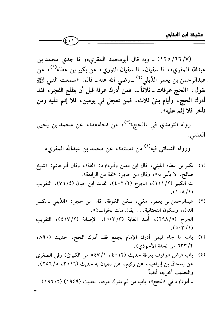 (7 / 66 / 125) - وَبِه قَالَ أَبُو مُحَمَّد المقريء، نَا جدي مُحَمَّد بن عبد الله المقريء، نَا سُفْيَانُ، نَا سُفْيَانُ الثَّوْرِيُّ، عَنْ بُكَيْرِ بْنِ عَطَاءٍ، عَنْ عَبْدِ الرَّحْمَنِ بْنِ يَعْمُرَ الدِّيلِيِّ - رَضِيَ اللَّهُ عَنْهُ - قَالَ: " سَمِعْتُ النَّبِيَّ - صَلَّى اللَّهُ عَلَيْهِ وَسَلَّم َ - يَقُولُ: " الْحَجُّ عَرَفَاتٌ - ثَلَاثًا -، فَمَنْ أَدْرَكَ عَرَفَةَ قَبْلَ أَنْ يَطْلُعَ الْفَجْرُ، فَقَدْ أَدْرَكَ الْحَجَّ، وَأَيَّامُ مِنًى ثَلَاثٌ، فَمَنْ تَعَجَّلَ فِي يَوْمَيْنِ، فَلَا إِثْمَ عَلَيْهِ وَمَنْ تَأَخَّرَ فَلَا إِثْمَ عَلَيْهِ ".