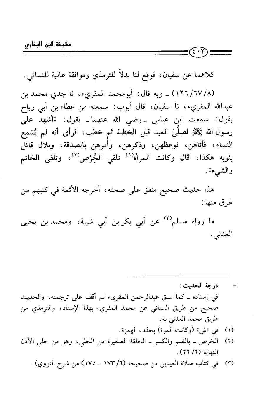 (8 / 67 / 126) - وَبِهِ قَالَ: أَبُو مُحَمَّد المقريء، نَا جدي مُحَمَّد بن عبد الله المقريء، نَا سُفْيَانُ، قَالَ أَيُّوبُ: سَمِعْتُهُ مِنْ عَطَاءِ بْنِ أَبِي رَبَاح يَقُولُ: سَمِعْتُ ابْنَ عَبَّاسٍ - رَضِيَ اللَّهُ عَنْهُمَا - يَقُولُ: " أَشْهَدُ عَلَى رَسُولِ الله - صَلَّى اللَّهُ عَلَيْهِ وَسَلَّم َ - لَصَلَّى الْعِيدَ قَبْلَ الْخُطْبَةِ ثُمَّ خَطَبَ، فَرَأَى أَنَّهُ لَمْ يُسْمِعِ النِّسَاءَ، فَأَتَاهُنَّ، فَوَعَظَهُنَّ، وَذَكَّرَهُنَّ، وَأَمَرَهُنَّ بِالصَّدَقَةِ،، وَبِلَالٌ قَائِلٌ بِثَوْبِهِ هَكَذَا، قَالَ وَكَانَت الْمَرْأَة تلقي الْخرص، وتلقي الحاتم وَالشَّيْءَ ".