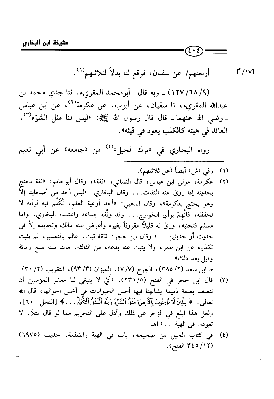 (9 / 68 / 127) - وَبِه قَالَ أَبُو مُحَمَّد المقريء، ثَنَا جدي مُحَمَّد بن عبد الله المقريء، نَا سُفْيَانُ، عَنْ أَيُّوبَ، عَنْ عِكْرِمَةَ، عَنِ ابْنِ عَبَّاسٍ - رَضِيَ اللَّهُ عَنْهُمَا - قَالَ، قَالَ رَسُول الله - صَلَّى اللَّهُ عَلَيْهِ وَسَلَّم َ -: " لَيْسَ لَنَا مَثَلُ السَّوْءِ، الْعَائِدُ فِي هِبَتِهِ كَالْكَلْبِ يَعُودُ فِي قَيْئِهِ ".