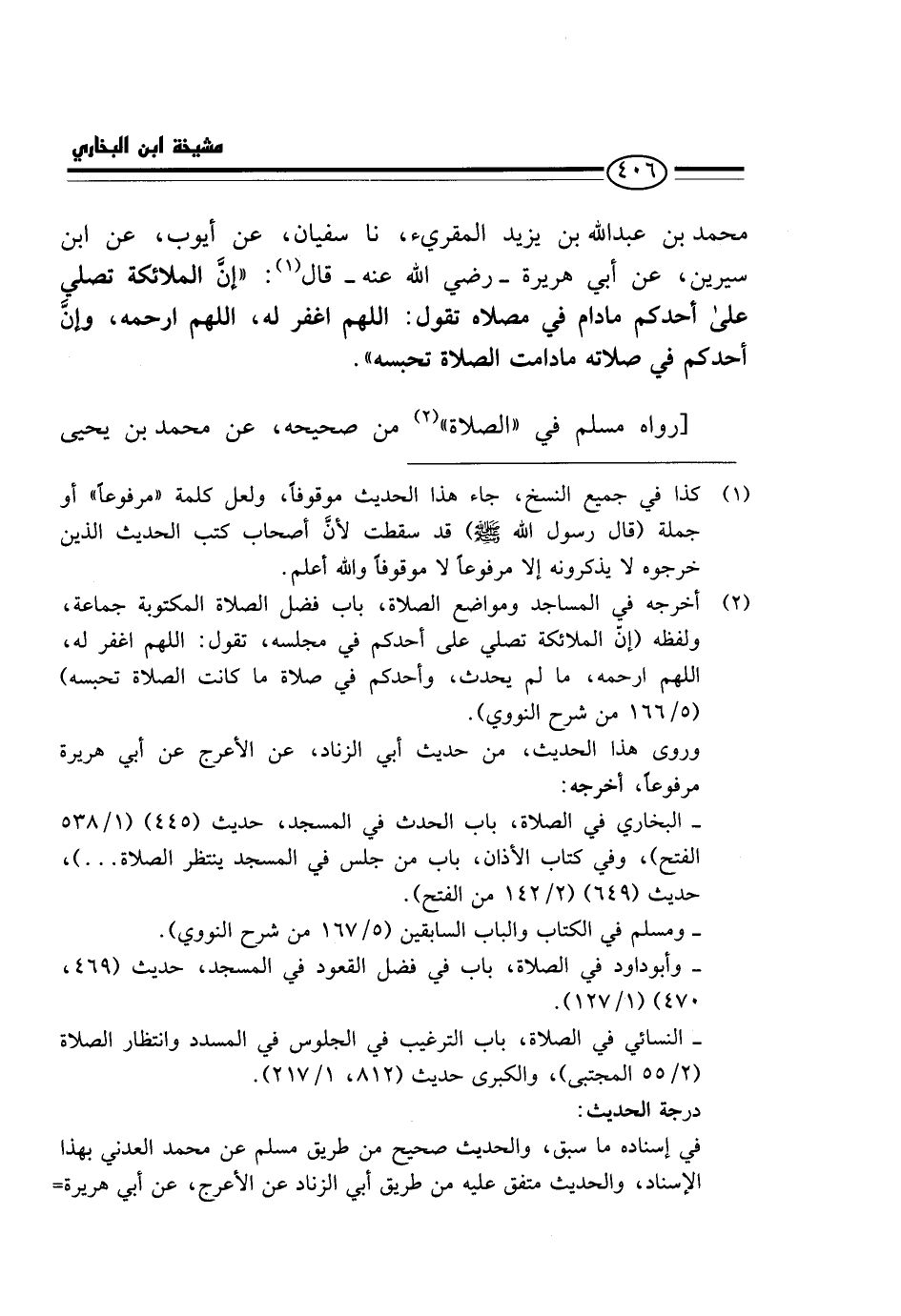 مُحَمَّدِ بْنِ عَبْدِ اللَّهِ بْنِ يَزِيدَ الْمُقْرِئُ، نَا سُفْيَانُ، عَنْ أَيُّوبَ، عَنِ ابْنِ سِيرِينَ، عَنْ أَبِي هُرَيْرَةَ - رَضِيَ اللَّهُ عَنْهُ - قَالَ: " إِنَّ الْمَلَائِكَةَ تُصَلِّي عَلَى أَحَدِكُمْ مَا دَامَ فِي مُصَلَّاهُ تَقُولُ: اللَّهُمَّ اغْفِرْ لَهُ، اللَّهُمَّ ارْحَمْهُ، وَإِنَّ أَحَدَكُمْ فِي صَلَاتِهِ مَا دَامَتِ الصَّلَاةُ تَحْبِسُهُ ". [رَوَاهُ مُسْلِمٌ فِي " الصَّلَاةِ " مِنْ صَحِيحِهِ، عَنْ مُحَمَّدِ بْنِ يَحْيَى