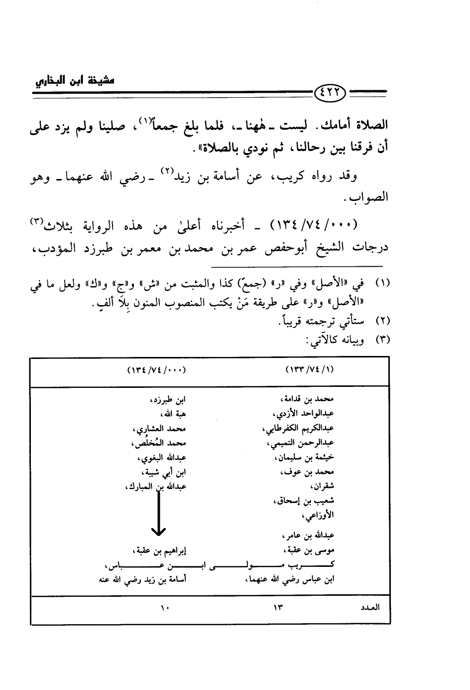 (000 / 74 / 134) - أَخْبَرَنَاهُ أَعْلَى مِنْ هَذِهِ الرِّوَايَةِ بِثَلَاثِ دَرَجَاتٍ الشَّيْخُ أَبُو حَفْصٍ عُمَرُ بْنُ مُحَمَّدِ بْنِ مَعْمَرِ بْنِ طبرزد الْمُؤَدب،