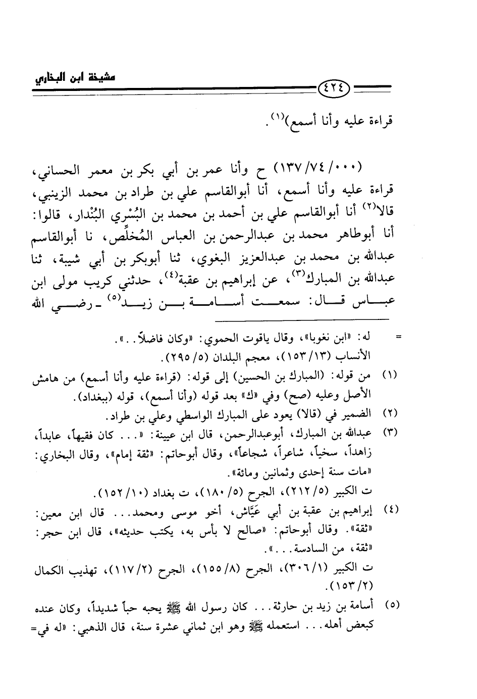 (000 / 74 / 137) ح وَأَنَا عُمَرُ بْنُ أَبِي بَكْرِ بْنِ مَعْمَرٍ الْحَسَّانِيُّ، قِرَاءَةً عَلَيْهِ وَأَنَا أَسْمَعُ، أَنَا أَبُو الْقَاسِمِ عَلِيُّ بْنُ طَرَّادِ بْنِ مُحَمَّدٍ الزَّيْنَبِيُّ، قَالَا أَنَا أَبُو الْقَاسِمِ عَلِيُّ بْنُ أَحْمَدَ بْنِ مُحَمَّدِ بْنِ الْبُسْرِيِّ الْبُنْدَارُ، قَالُوا: أَنَا أَبُو طَاهِرٍ مُحَمَّدُ بْنُ عَبْدِ الرَّحْمَنِ بْنِ الْعَبَّاسِ الْمُخَلِّصُ، نَا أَبُو الْقَاسِمِ عَبْدُ اللَّهِ بْنُ مُحَمَّدٍ بْنِ عَبْدِ الْعَزِيزِ الْبَغَوِيُّ، ثَنَا أَبُو بَكْرِ بْنُ أَبِي شَيْبَةَ، ثَنَا عَبْدُ اللَّهِ بْنُ الْمُبَارَكِ، عَنْ إِبْرَاهِيمَ بْنِ عُقْبَةَ، حَدَّثَنِي كُرَيْبٌ مَوْلَى ابْنِ عَبَّاسٍ قَالَ: سَمِعْتُ أُسَامَةَ بْنَ زَيْدٍ - رَضِيَ اللَّهُ