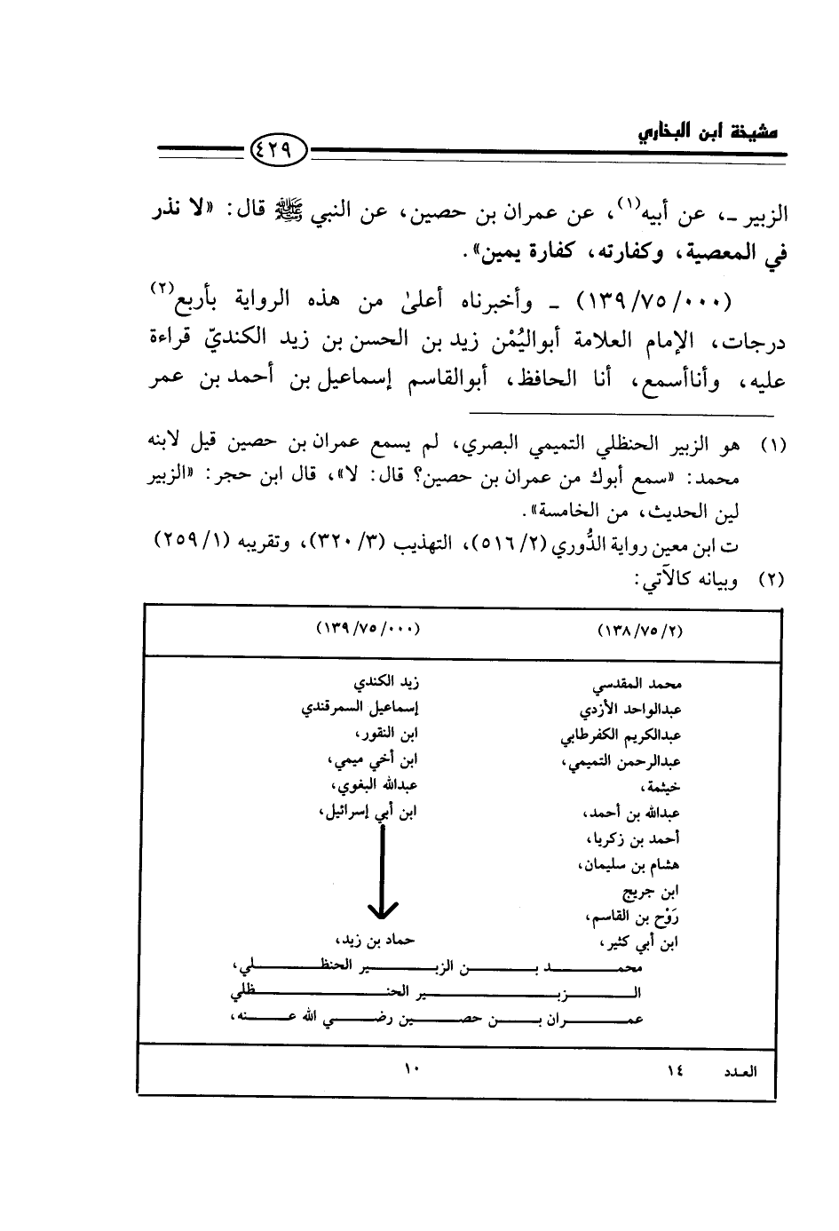 (000 / 75 / 139) - وَأَخْبَرَنَاهُ أَعْلَى مِنْ هَذِهِ الرِّوَايَةِ بِأَرْبَعِ دَرَجَاتٍ، الْإِمَامُ الْعَلَّامَةُ أَبُو الْيُمْنِ زَيْدُ بْنُ الْحَسَنِ بْنِ زَيْدٍ الْكِنْدِيُّ قِرَاءَةً عَلَيْهِ، وَأَنَا أَسْمَعُ، أَنَا الْحَافِظُ، أَبُو الْقَاسِمِ إِسْمَاعِيلُ بْنُ أَحْمَدَ بْنِ عُمَرَ