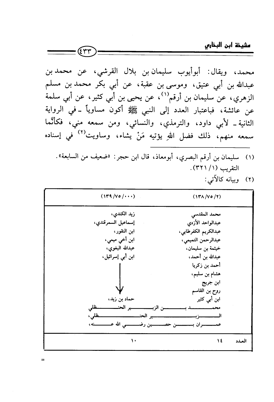 مُحَمَّدٍ، وَيُقَالُ: أَبُو أَيُّوبَ سُلَيْمَانُ بْنُ بِلَالٍ الْقُرَشِيُّ، عَنْ مُحَمَّدِ بْنِ عَبْدِ اللَّهِ بْنِ أَبِي عَتِيقٍ، وَمُوسَى بْنِ عُقْبَةَ، عَنْ أَبِي بَكْرٍ مُحَمَّدِ بْنِ مُسْلِمٍ الزُّهْرِيِّ، عَنْ سُلَيْمَانَ بْنِ أَرْقَمَ، عَنْ يَحْيَى بْنِ أَبِي كَثِيرٍ، عَنْ أَبِي سَلَمَةَ عَنْ عَائِشَةَ، فَبِاعْتِبَارِ الْعَدَدِ إِلَى النَّبِي - صَلَّى اللَّهُ عَلَيْهِ وَسَلَّم َ - أَكُونُ مُسَاوِيًا - فِي الرِّوَايَةِ الثَّانِيَةِ - لِأَبِي دَاوُدَ، وَالتِّرْمِذِيِّ، وَالنَّسَائِيِّ، وَمَنْ سَمِعَهُ مِنِّي، فَكَأَنَّمَا سَمِعَهُ مِنْهُمْ، ذَلِكَ فَضْلُ اللَّهِ يُؤْتِيهِ مَنْ يَشَاءُ، وَسَاوَيْتُ فِي إِسْنَادِهِ