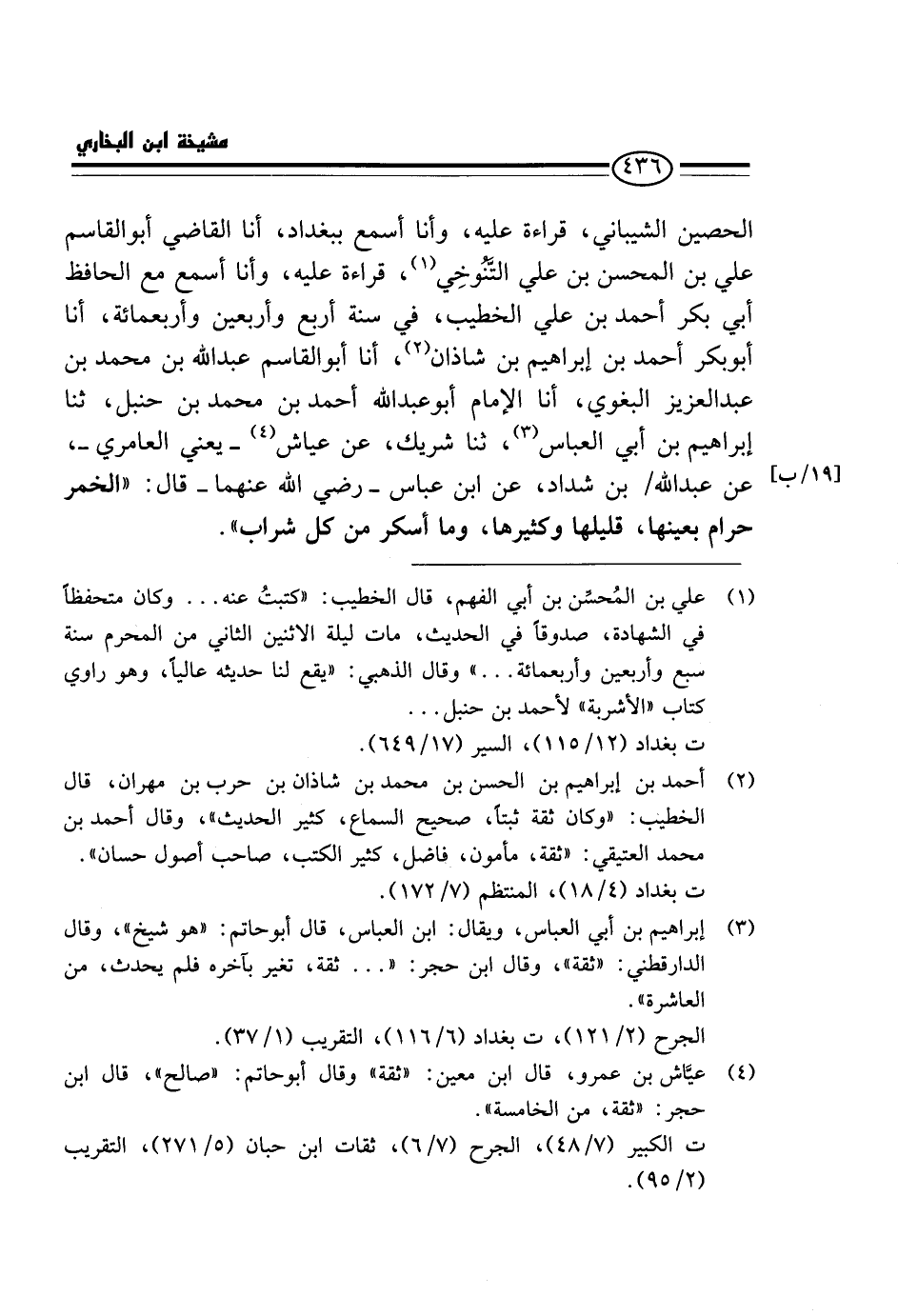 الْحُصَيْنِ الشَّيْبَانِيُّ، قِرَاءَةً عَلَيْهِ، وَأَنَا أَسْمَعُ بِبَغْدَادَ، أَنَا الْقَاضِي أَبُو الْقَاسِمِ عَلِيُّ بْنُ الْمُحْسِنِ بْنِ عَلِيٍّ التَّنُوخِيُّ، قِرَاءَةً عَلَيْهِ، وَأَنَا أَسْمَعُ مَعَ الْحَافِظِ أَبِي بَكْرٍ أَحْمَدَ بْنِ عَلِيٍّ الْخَطِيب، فِي سنة أَربع وَأَرْبَعين وَأَرْبَعمِائَة، أَنَا أَبُو بَكْرٍ أَحْمَدُ بْنُ إِبْرَاهِيمَ بْنِ شَاذان، أَنَا أَبُو الْقَاسِمِ عَبْدُ اللَّهِ بْنُ مُحَمَّدِ بْنِ عَبْدِ الْعَزِيزِ الْبَغَوِيُّ، أَنَا الْإِمَامُ أَبُو عَبْدِ اللَّهِ أَحْمَدَ بْنِ مُحَمَّدِ بْنِ حَنْبَلٍ، ثَنَا إِبْرَاهِيمُ بْنُ أَبِي الْعَبَّاسِ، ثَنَا شَرِيكٌ، عَنْ عَيَّاشٍ - يَعْنِي الْعَامِرِيَّ -، عَنْ عَبْدِ اللَّهِ / بْنِ شَدَّادٍ، عَنِ ابْنِ عَبَّاسٍ - رَضِيَ اللَّهُ عَنْهُمَا - قَالَ: " الْخَمْرُ حَرَامٌ بِعَيْنِهَا، قَلِيلُهَا وَكَثِيرُهَا، وَمَا أَسْكَرَ مِنْ كُلِّ شَرَابٍ ".