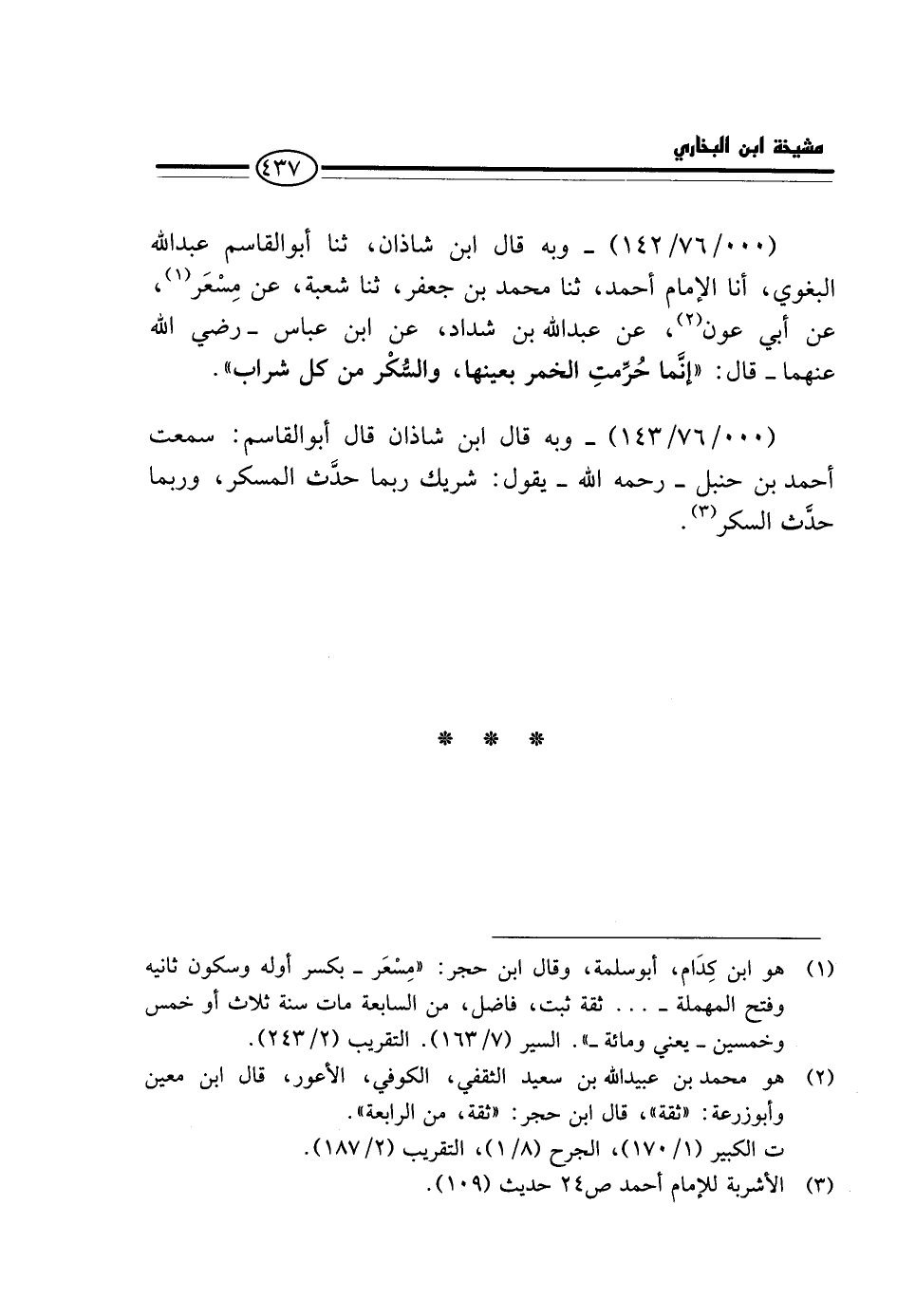 (000 / 76 / 142) - وَبِهِ قَالَ ابْنُ شَاذَانَ، ثَنَا أَبُو الْقَاسِمِ عَبْدُ اللَّهِ الْبَغَوِيُّ، أَنَا الْإِمَامُ أَحْمَدُ، ثَنَا مُحَمَّدُ بْنُ جَعْفَرٍ، ثَنَا شُعْبَةُ، عَنْ مِسْعَرٍ، عَنْ أَبِي عَوْنٍ، عَنْ عَبْدِ اللَّهِ بْنِ شَدَّادٍ، عَنِ ابْنِ عَبَّاسٍ - رَضِيَ اللَّهُ عَنْهُمَا - قَالَ: " إِنَّمَا حُرِّمَتِ الْخَمْرُ بِعَيْنِهَا، وَالسَّكَرُ مِنْ كُلِّ شَرَابٍ ".