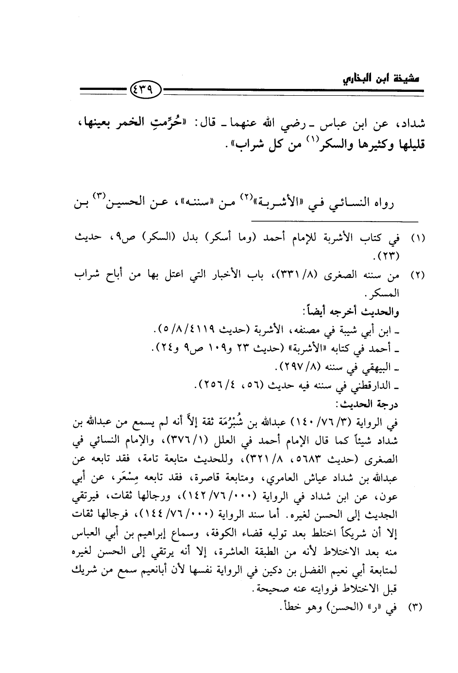 شَدَّادٍ، عَنِ ابْنِ عَبَّاسٍ - رَضِيَ اللَّهُ عَنْهُمَا - قَالَ: " حُرِّمَتِ الْخَمْرُ بِعَيْنِهَا، قَلِيلُهَا وَكَثِيرُهَا وَالسَّكَرُ مِنْ كُلِّ شَرَابٍ ".