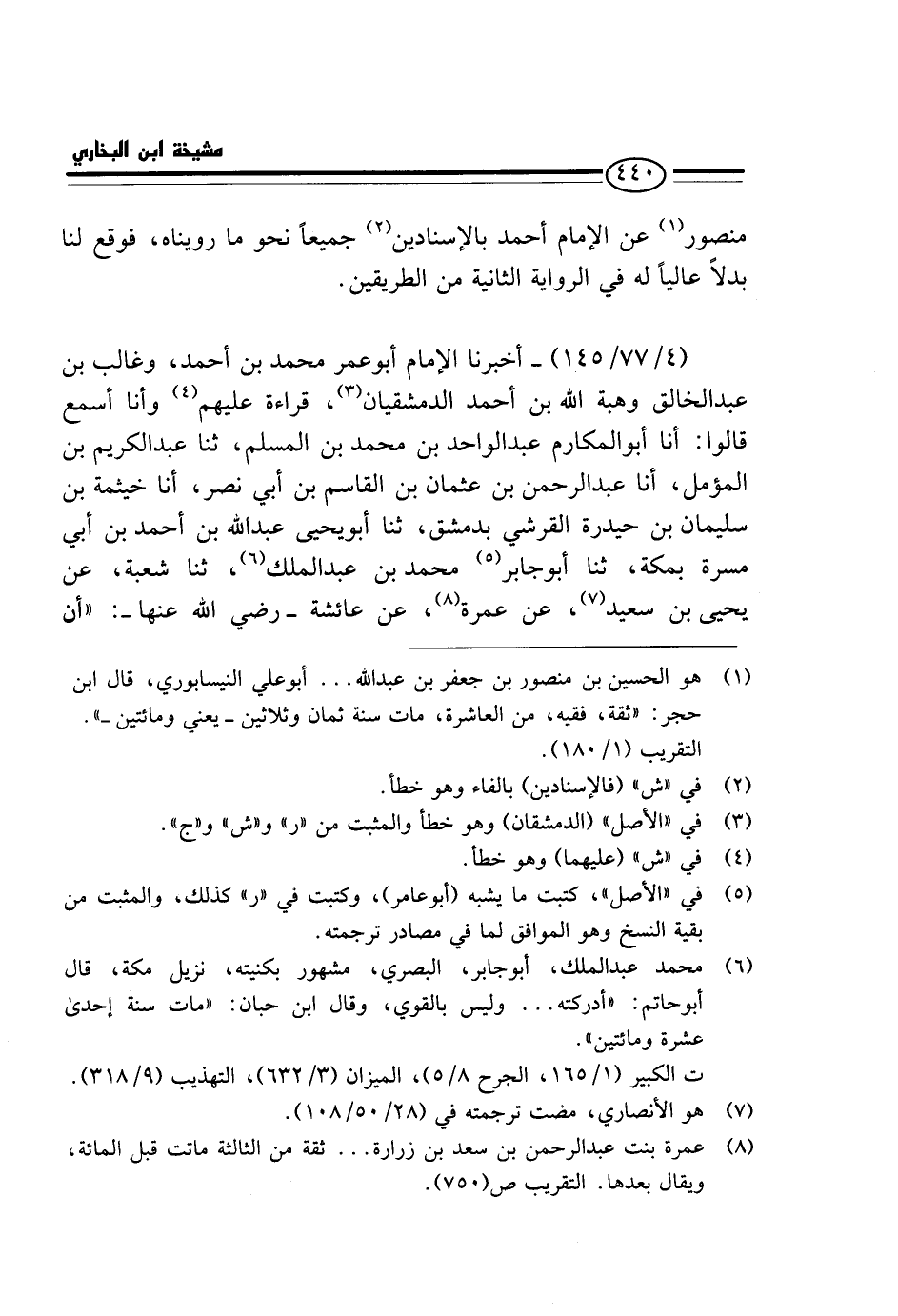 (4 / 77 / 145) - أَخْبَرَنَا الْإِمَامُ أَبُو عُمَرَ مُحَمَّدُ بْنُ أَحْمَدَ، وَغَالِبُ بْنُ عَبْدِ الْخَالِقِ وَهِبَةُ اللَّهِ بْنُ أَحْمَدَ الدِّمَشْقِيَّانِ، قِرَاءَةً عَلَيْهِمْ وَأَنَا أَسْمَعُ قَالُوا: أَنَا أَبُو الْمَكَارِمِ عَبْدُ الْوَاحِدِ بْنُ مُحَمَّدِ بْنِ الْمُسْلِمِ، ثَنَا عَبْدُ الْكَرِيمِ بْنُ الْمُؤَمَّلِ، أَنَا عَبْدُ الرَّحْمَنِ بْنُ عُثْمَانَ بْنِ الْقَاسِمِ بْنِ أَبِي نَصْرٍ، أَنَا خَيْثَمَةُ بْنُ سُلَيْمَانَ بْنِ حَيْدَرَةَ الْقُرَشِيُّ بِدِمَشْقَ، ثَنَا أَبُو يَحْيَى عَبْدُ اللَّهِ بْنُ أَحْمَدَ بْنِ أَبِي مَسَرَّةَ بِمَكَّةَ، ثَنَا أَبُو جَابِرٍ مُحَمَّدُ بْنُ عَبْدِ الْمَلِكِ، ثَنَا شُعْبَةُ، عَنْ يَحْيَى بْنِ سَعِيدٍ، عَنْ عَمْرَةَ، عَنْ عَائِشَةَ - رَضِيَ اللَّهُ عَنْهَا -: " أَنَّ