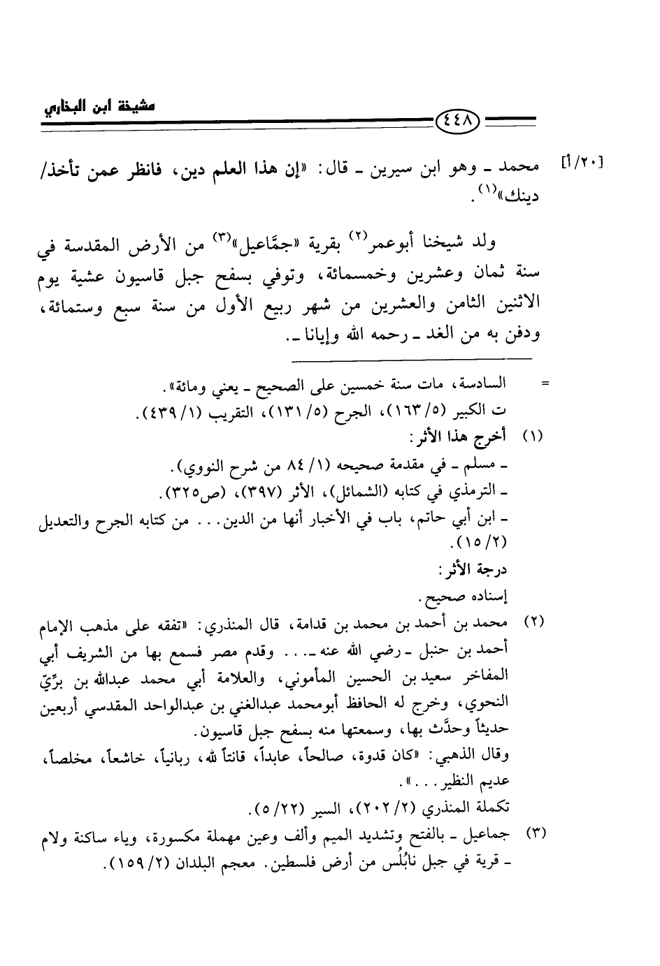 مُحَمَّدٍ - وَهُوَ ابْنُ سِيرِينَ - قَالَ: " إِنَّ هَذَا الْعِلْمَ دِينٌ، فَانْظُرْ عَمَّنْ تَأْخُذُ / دِينَكَ ".