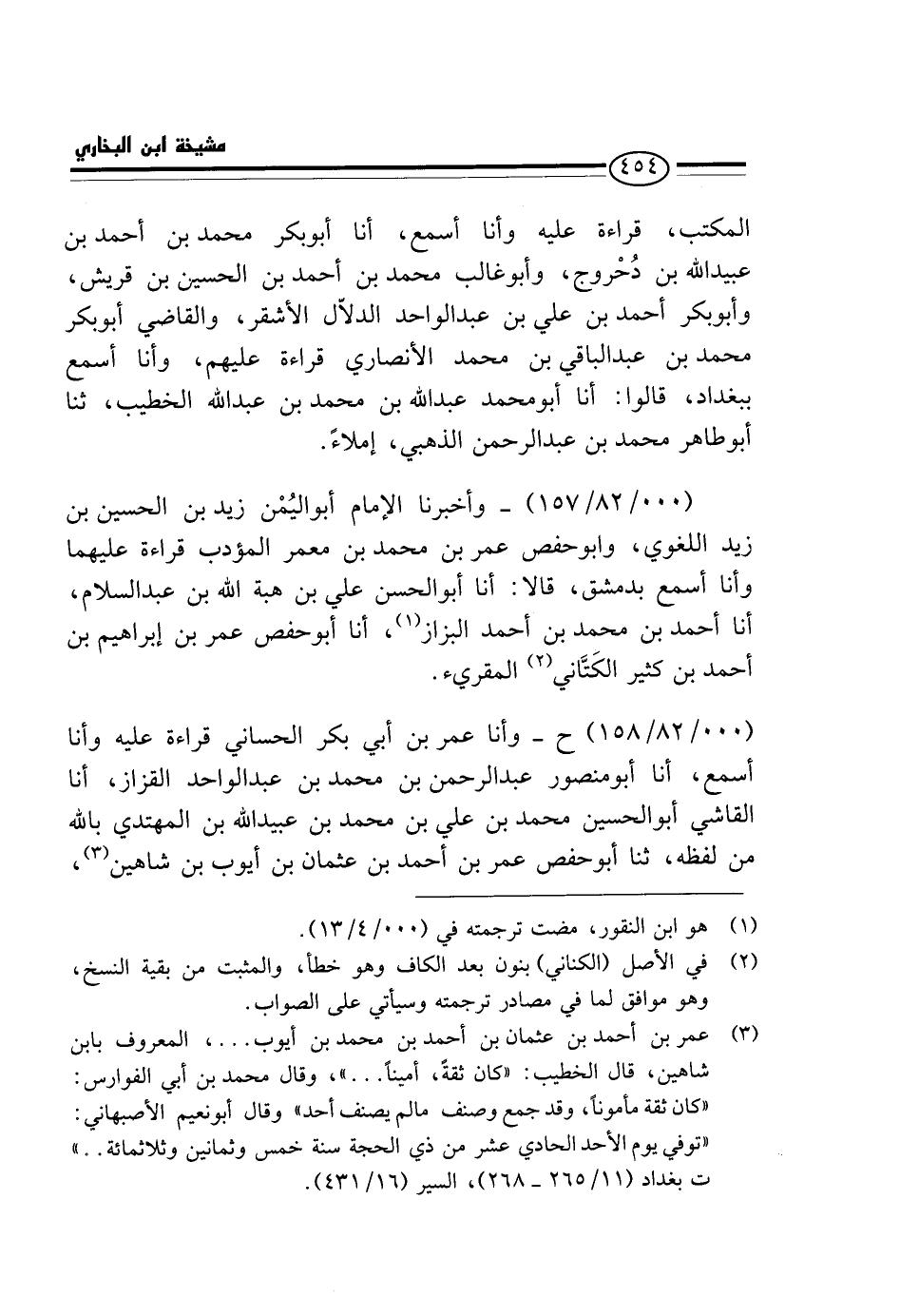 (000 / 82 / 157) - وَأَخْبَرَنَا الْإِمَامُ أَبُو الْيُمْنِ زَيْدُ بْنُ الْحُسَيْنِ بْنِ زَيْدٍ اللُّغَوِيُّ، وَأَبُو حَفْصٍ عُمَرُ بْنُ مُحَمَّدِ بْنِ مَعْمَرٍ الْمُؤَدِّبُ قِرَاءَةً عَلَيْهِمَا وَأَنَا أَسْمَعُ بِدِمَشْقَ، قَالَا: أَنَا أَبُو الْحَسَنِ عَلِيُّ بْنُ هِبَةِ اللَّهِ بْنِ عَبْدِ السَّلامِ أَنَا أَحْمَدُ بْنُ مُحَمَّدِ بْنِ أَحْمَدَ الْبَزَّازُ، أَنَا أَبُو حَفْصٍ عُمَرُ بْنُ إِبْرَاهِيمَ بْنِ أَحْمَدَ بْنِ كَثِيرٍ الْكَتَّانِيُّ الْمُقْرِئُ.