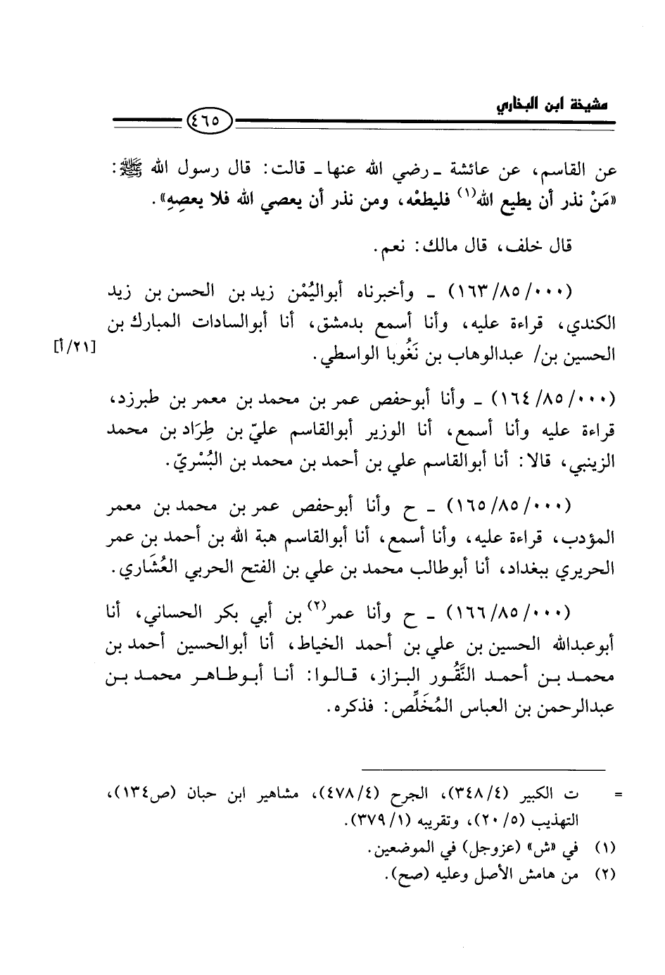 (000 / 85 / 166) - ح وَأَنَا عُمَرُ بْنُ أَبِي بَكْرٍ الْحَسَّانِيُّ، أَنَا أَبُو عَبْدِ اللَّهِ الْحُسَيْنُ بْنُ عَلِيِّ بْنِ أَحْمَدَ الْخَيَّاطُ، أَنَا أَبُو الْحُسَيْن احْمَد بن مُحَمَّد بن أَحْمد النَّقُّورِ الْبَزَّازُ، قَالُوا: أَنَا أَبُو طَاهِرٍ مُحَمَّدُ بْنُ عَبْدِ الرَّحْمَنِ بْنِ الْعَبَّاسِ الْمُخَلِّصُ: فَذَكَرَهُ.