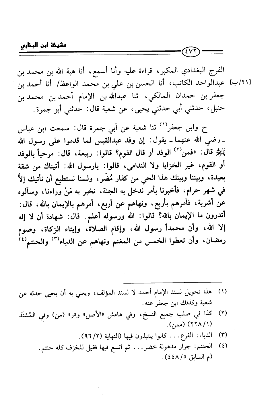 الْفَرَجِ الْبَغْدَادِيُّ الْمُكَبِّرُ، قِرَاءَةً عَلَيْهِ وَأَنَا أَسْمَعُ، أَنَا هِبَةُ اللَّهِ بْنُ مُحَمَّدِ بْنِ عَبْدِ الْوَاحِدِ الْكَاتِبُ، أَنَا الْحَسَنُ بْنُ عَلِيِّ بْنِ مُحَمَّدٍ الْوَاعِظُ / أَنَا أَحْمَدُ بْنُ جَعْفَرِ بْنِ حمدَان الْمَالِكِي، ثَنَا عبد الله بن الْإِمَامِ أَحْمَدَ بْنِ مُحَمَّدِ بْنِ حَنْبَلٍ، حَدَّثَنِي أَبِي حَدَّثَنِي يَحْيَى، عَنْ شُعْبَةَ قَالَ: حَدَّثَنِي أَبُو جَمْرَةَ.