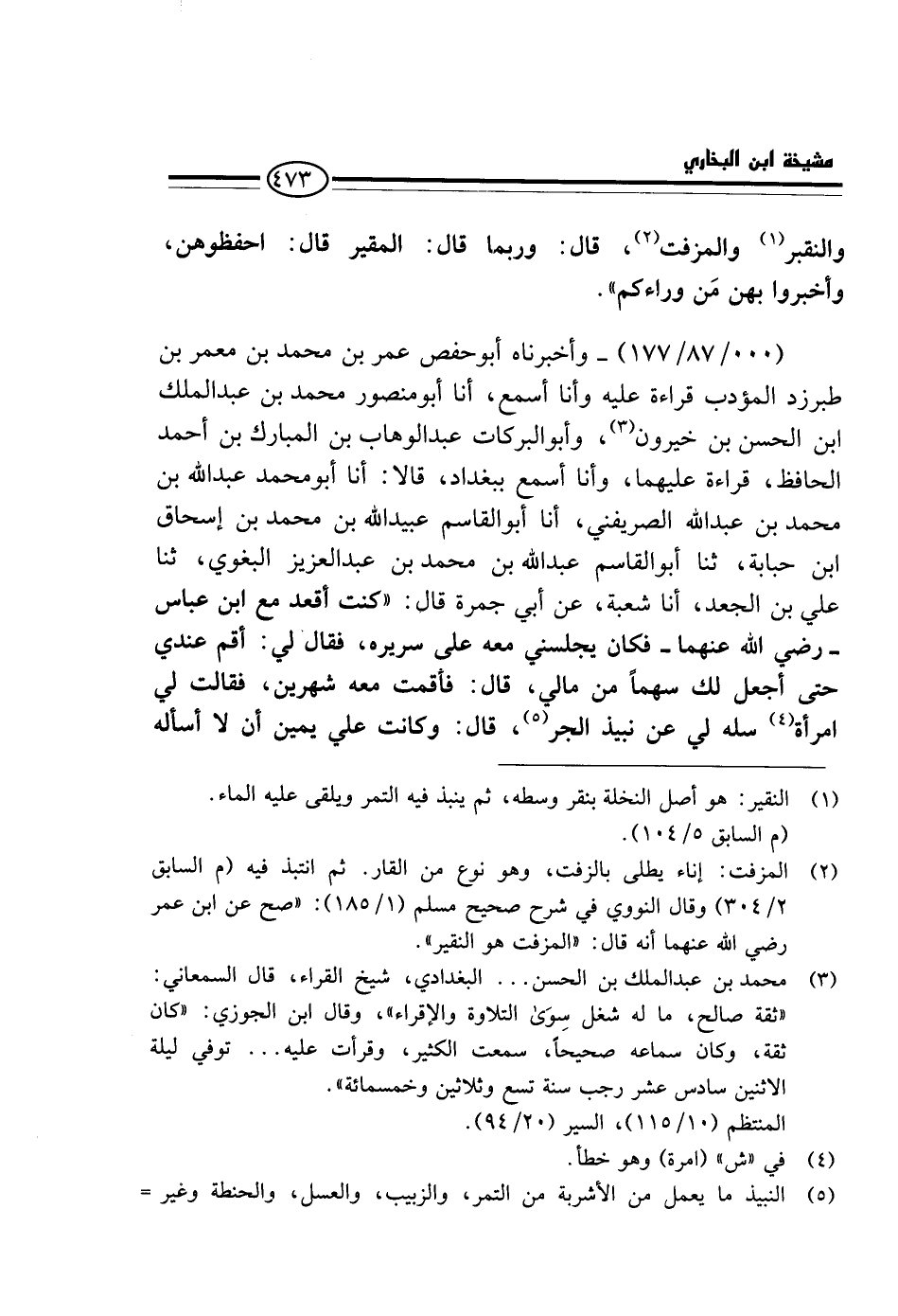 (000 / 87 / 177) - وَأَخْبَرَنَاهُ أَبُو حَفْصٍ عُمَرُ بْنُ مُحَمَّدِ بْنِ مَعْمَرِ بْنِ طَبَرْزَدَ الْمُؤَدِّبُ قِرَاءَةً عَلَيْهِ وَأَنَا أَسْمَعُ، أَنَا أَبُو مَنْصُور مُحَمَّد بن عبد الْملك ابْن الْحَسَنِ بْنِ خَيْرُونَ، وَأَبُو الْبَرَكَاتِ عَبْدُ الْوَهَّابِ بْنُ الْمُبَارَكِ بْنِ أَحْمَدَ الْحَافِظُ، قِرَاءَةً عَلَيْهِمَا، وَأَنَا أَسْمَعُ بِبَغْدَادَ، قَالَا: أَنَا أَبُو مُحَمَّدٍ عَبْدُ اللَّهِ بْنُ مُحَمَّدِ بْنِ عَبْدِ اللَّهِ الصريفني، أَنَا أَبُو الْقَاسِمِ عُبَيْدُ اللَّهِ بْنُ مُحَمَّدِ بن إِسْحَاق ابْنُ حُبَابَةَ، ثَنَا أَبُو الْقَاسِمِ عَبْدُ اللَّهِ بْنُ مُحَمَّدِ بْنِ عَبْدِ الْعَزِيزِ الْبَغَوِيُّ، ثَنَا عَلِيُّ بْنُ الْجَعْدِ، أَنَا شُعْبَةُ، عَنْ أَبِي جَمْرَةَ قَالَ: " كُنْتُ أَقْعُدُ مَعَ ابْنِ عَبَّاسٍ - رَضِيَ اللَّهُ عَنْهُمَا - فَكَانَ يُجْلِسُنِي مَعَهُ عَلَى سَرِيرِهِ، فَقَالَ لِي: أَقِمْ عِنْدِي حَتَّى أَجْعَلَ لَكَ سَهْمًا مِنْ مَالِي، قَالَ: فَأَقَمْتُ مَعَهُ شَهْرَيْنِ، فَقَالَتْ لِي امْرَأَةٌ سَلْهُ لِي عَنْ نَبِيذِ الْجَرِّ، قَالَ: وَكَانَتْ عَلَيَّ يَمِينٌ أَنْ لَا أسأله