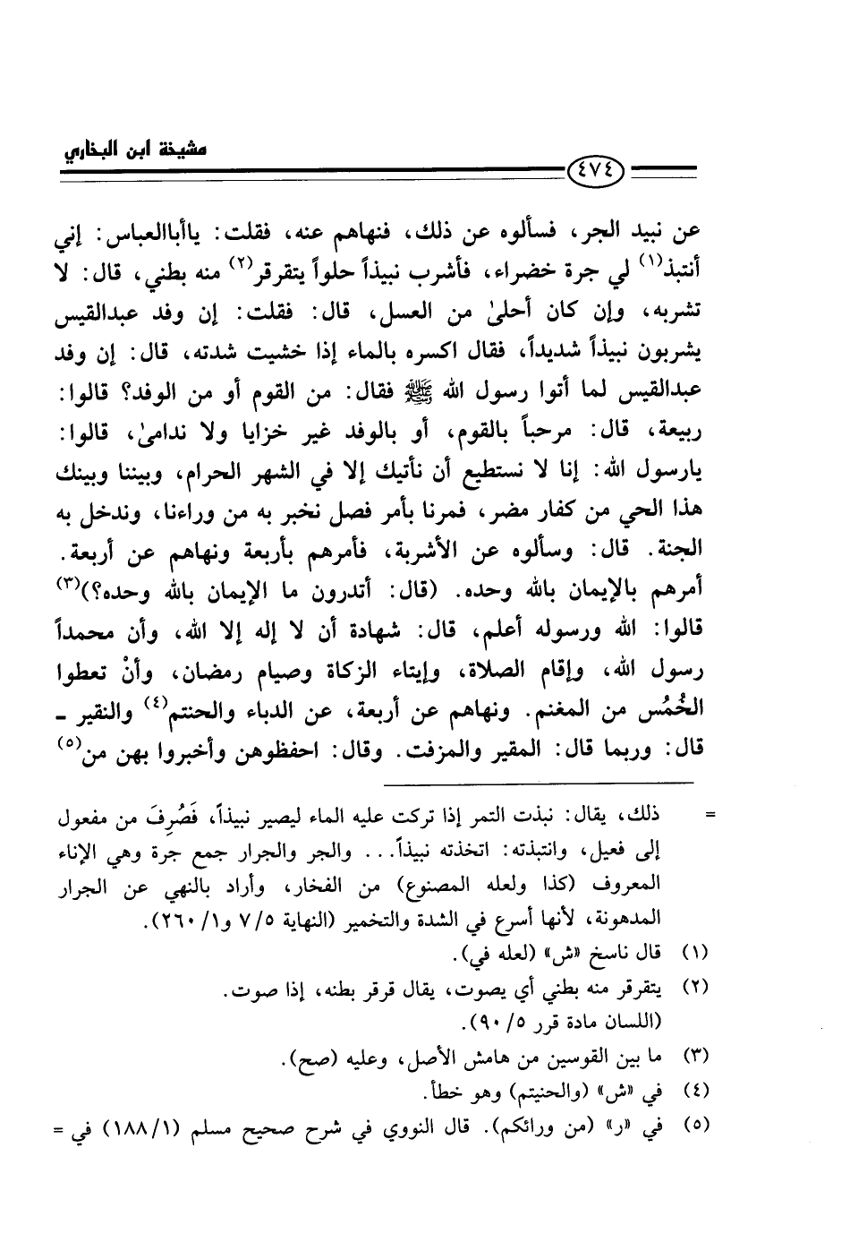 عَنْ نَبِيذِ الْجَرِّ، فَسَأَلُوهُ عَنْ ذَلِكَ، فَنَهَاهُمْ عَنْهُ، فَقُلْتُ: يَا أَبَا الْعَبَّاسِ: إِنِّي أَنْتَبِذُ لِي جَرَّةً خَضْرَاءَ، فَأَشْرَبُ نَبِيذًا حُلْوًا يَتَقَرْقَرُ مِنْهُ بَطْنِي، قَالَ: لَا تَشْرَبْهُ، وَإِنْ كَانَ أَحْلَى مِنَ الْعَسَلِ، قَالَ: فَقُلْتُ، إِنَّ وَفْدَ عَبْدِ الْقَيْسِ يَشْرَبُونَ نَبِيذًا شَدِيدًا، فَقَالَ اكْسِرْهُ بِالْمَاءِ إِذَا خَشِيتَ شِدَّتَهُ، قَالَ: إِنَّ وَفْدَ عبد الْقَيْس لما اتوا رَسُول الله - صَلَّى اللَّهُ عَلَيْهِ وَسَلَّم َ - فَقَالَ: مَنِ الْقَوْمُ أَوْ مَنِ الْوَفْدُ؟ قَالُوا: رَبِيعَةُ، قَالَ: مَرْحَبًا بِالْقَوْمِ، أَوْ بِالْوَفْدِ غَيْرَ خَزَايَا وَلَا نَدَامَى، قَالُوا: يَا رَسُولَ اللَّهِ: إِنَّا لَا نَسْتَطِيعُ أَنْ نَأْتِيَكَ إِلَّا فِي الشَّهْرِ الْحَرَامِ، وَبَيْنَنَا وَبَيْنَكَ هَذَا الْحَيُّ مِنْ كُفَّارِ مُضَرَ، فَمُرْنَا بِأَمْرٍ فَصْلٍ نُخْبِرُ بِهِ مَنْ وَرَاءَنَا، وَنَدْخُلُ بِهِ الْجَنَّةَ، قَالَ: وَسَأَلُوهُ عَنِ الْأَشْرِبَةِ، فَأَمَرَهُمْ بِأَرْبَعَةٍ وَنَهَاهُمْ عَنْ أَرْبَعَةٍ. أَمَرَهُمْ بِالْإِيمَانِ بِاللَّهِ وَحْدَهُ. (قَالَ: أَتَدْرُونَ مَا الْإِيمَانُ بِاللَّهِ وَحْدَهُ؟) قَالُوا: اللَّهُ وَرَسُولُهُ أَعْلَمُ، قَالَ: شَهَادَةُ أَنْ لَا إِلَهَ إِلَّا اللَّهُ، وَأَنَّ مُحَمَّدًا رَسُولُ اللَّهِ، وَإِقَامُ الصَّلَاةِ، وَإِيتَاءُ الزَّكَاةِ وَصِيَامُ رَمَضَانَ، وَأَنْ تُعْطُوا الْخُمْسَ مِنَ الْمَغْنَمِ. وَنَهَاهُمْ عَنْ أَرْبَعَةٍ، عَنِ الدُّبَّاءِ وَالْحَنْتَمِ وَالنَّقِيرِ - قَالَ: وَرُبَّمَا قَالَ: الْمُقَيَّرِ وَالْمُزَفَّتِ. وَقَالَ: احْفَظُوهُنَّ وَأَخْبِرُوا بِهِنَّ مَنْ