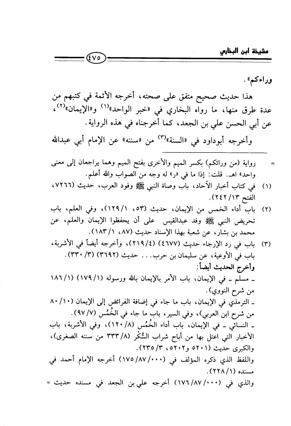 هَذَا حَدِيثٌ صَحِيح مُتَّفَقٌ عَلَى صِحَّتِهِ، أَخْرَجَهُ الْأَئِمَّةُ فِي كُتُبِهِمْ مِنْ عِدَّةِ طُرُقٍ مِنْهَا، مَا رَوَاهُ الْبُخَارِيُّ فِي " خَبَرِ الْوَاحِدِ " وَ " الْإِيمَانِ "، عَنْ أَبِي الْحَسَنِ عَلِيِّ بْنِ الْجَعْدِ، كَمَا أَخْرَجْنَاهُ فِي هَذِهِ الرِّوَايَةِ.