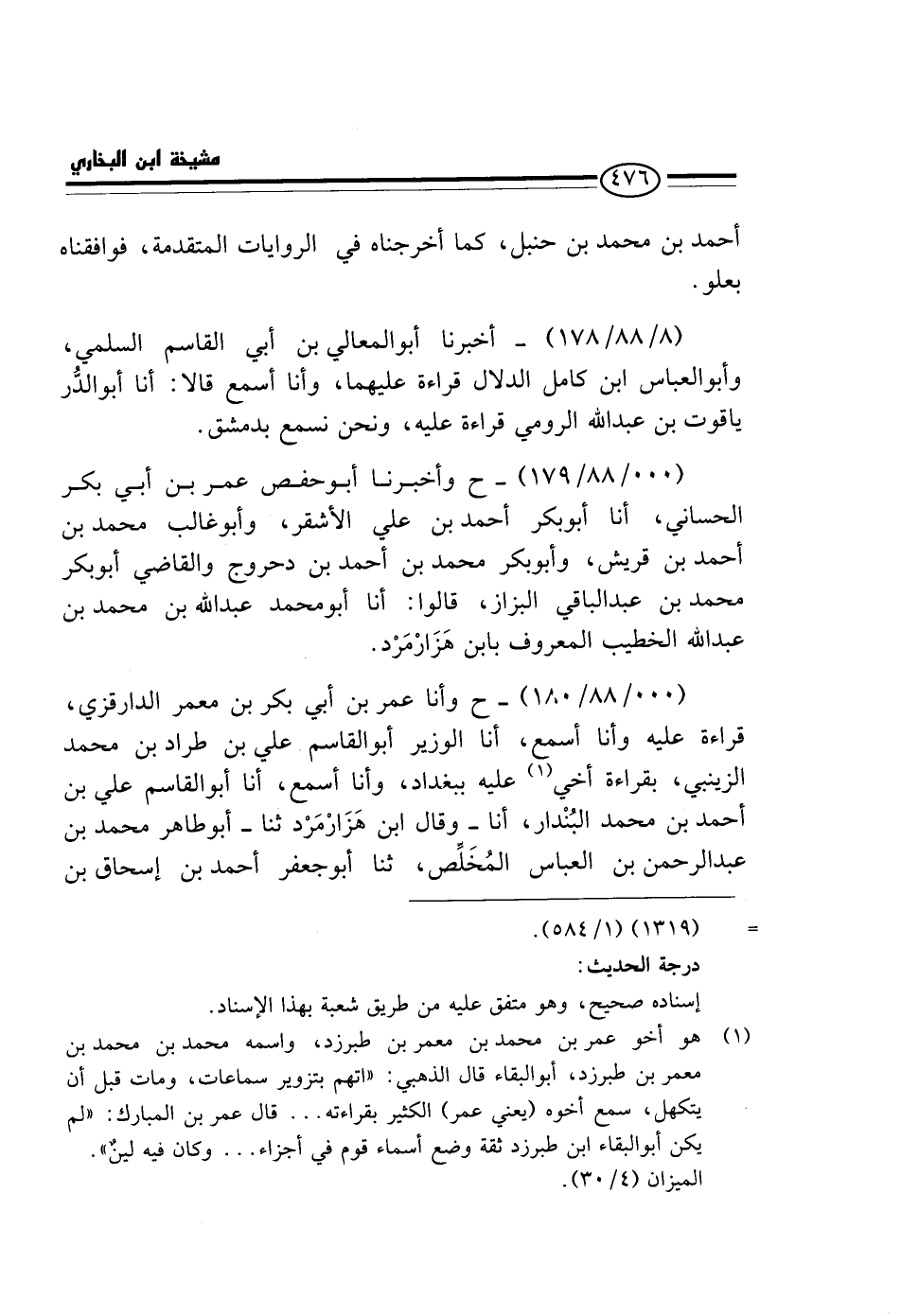 (000 / 88 / 179) - ح وَأَخْبَرَنَا أَبُو حَفْصٍ عُمَرُ بْنُ أَبِي بَكْرٍ الْحَسَّانِيُّ، أَنا أَبُو بَكْرٍ أَحْمَدُ بْنُ عَلِيٍّ الْأَشْقَرُ، وَأَبُو غَالِبٍ مُحَمَّدُ بْنُ أَحْمَدَ بْنِ قُرَيْشٍ، وَأَبُو بَكْرٍ مُحَمَّدُ بْنُ أَحْمَدَ بْنِ دَحْرُوجٍ وَالْقَاضِي أَبُو بَكْرٍ مُحَمَّدُ بْنُ عَبْدِ الْبَاقِي الْبَزَّازُ، قَالُوا: أَنَا أَبُو مُحَمَّدٍ عَبْدُ اللَّهِ بْنُ مُحَمَّدِ بْنِ عَبْدِ اللَّهِ الْخَطِيبُ الْمَعْرُوفُ بِابْنِ هَزَارْمَرْدَ.
