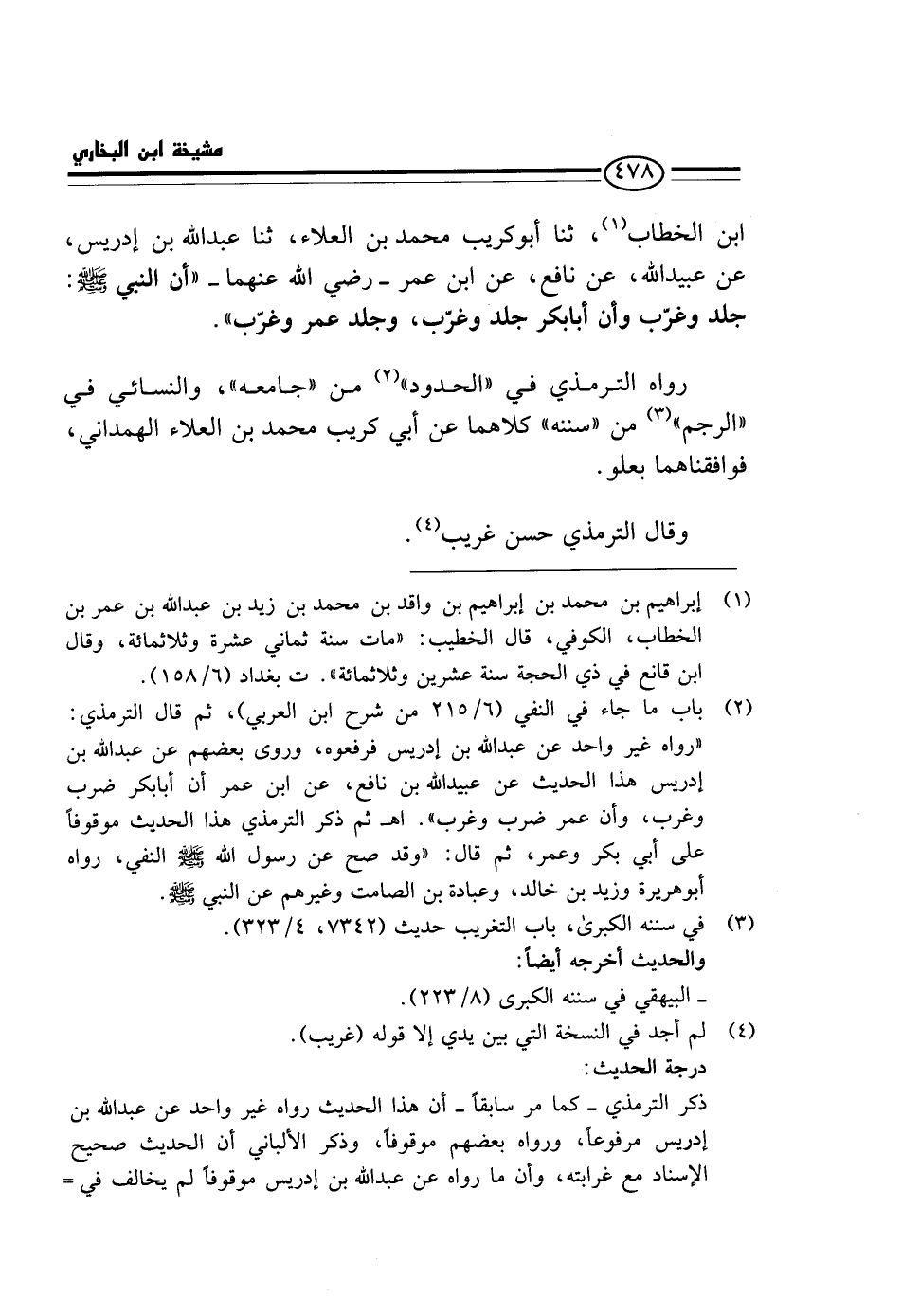 ابْن الْخَطَّابِ، ثَنَا أَبُو كُرَيْبٍ مُحَمَّدُ بْنُ الْعَلاءِ، ثَنَا عَبْدُ اللَّهِ بْنُ إِدْرِيسَ، عَنْ عُبَيْدِ اللَّهِ، عَنْ نَافِعٍ، عَنِ ابْنِ عُمَرَ - رَضِيَ الله عَنْهُمَا - " أَن النَّبِي - صَلَّى اللَّهُ عَلَيْهِ وَسَلَّم َ -: جَلَدَ وَغَرَّبَ وَأَنَّ أَبَا بَكْرٍ جَلَدَ وَغَرَّبَ، وَجَلَدَ عُمَرُ وَغَرَّبَ ".