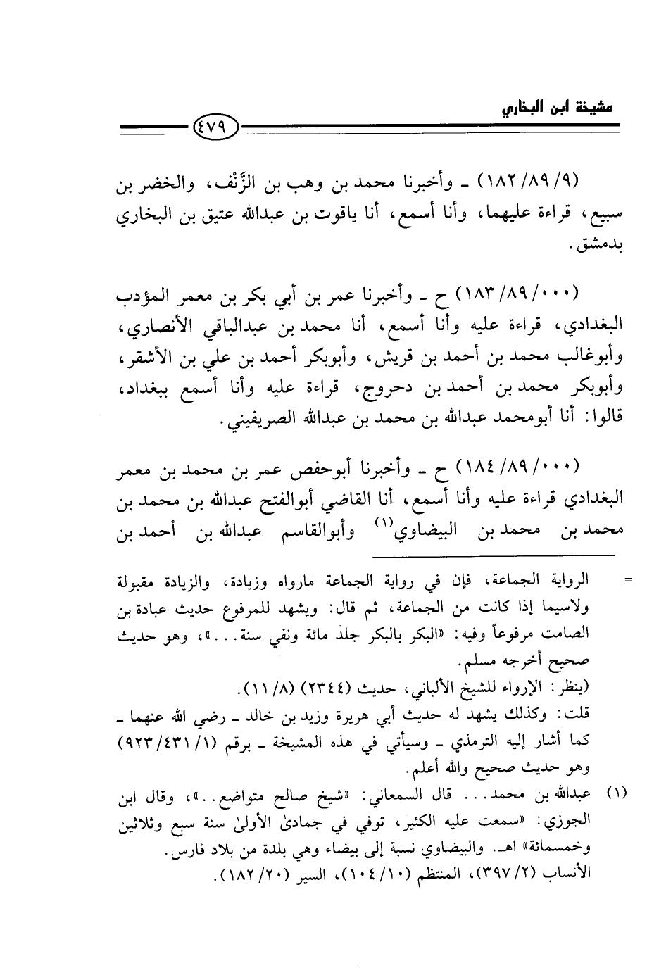 (000 / 89 / 184) ح - وَأَخْبَرَنَا أَبُو حَفْصٍ عُمَرُ بْنُ مُحَمَّدِ بْنِ مَعْمَرٍ الْبَغْدَادِيُّ قِرَاءَةً عَلَيْهِ وَأَنَا أَسْمَعُ، أَنَا الْقَاضِي أَبُو الْفَتْح عَبْدُ اللَّهِ بْنُ مُحَمَّدِ بْنِ مُحَمَّدِ بْنِ مُحَمَّدِ بْنِ الْبَيْضَاوِيِّ، وَأَبُو الْقَاسِمِ عَبْدُ اللَّهِ بْنُ أَحْمَدَ بْنِ