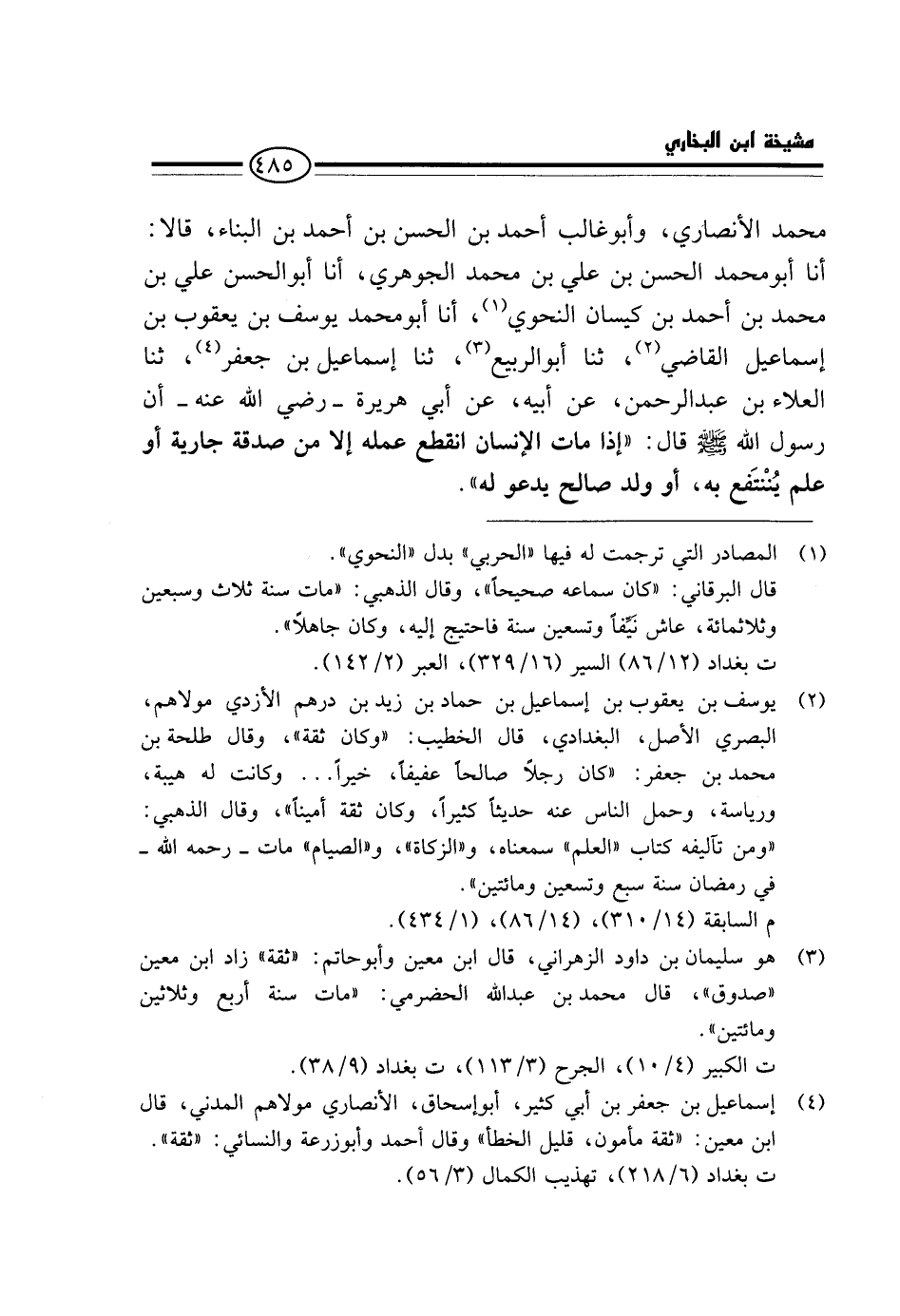 مُحَمَّدٍ الْأَنْصَارِيُّ، وَأَبُو غَالِبٍ أَحْمَدُ بْنُ الْحَسَنِ بْنِ أَحْمَدَ بْنِ الْبَنَّاءِ، قَالَا: أَنَا أَبُو مُحَمَّدٍ الْحَسَنُ بْنُ عَلِيِّ بْنِ مُحَمَّدٍ الْجَوْهَرِيُّ، أَنَا أَبُو الْحَسَنِ عَلِيُّ بْنُ مُحَمَّدِ بْنِ أَحْمَدَ بْنِ كَيْسَانَ النَّحْوِيُّ، أَنَا أَبُو مُحَمَّدٍ يُوسُفُ بْنُ يَعْقُوبَ بْنِ إِسْمَاعِيلَ الْقَاضِي، ثَنَا أَبُو الرَّبِيعِ، ثَنَا إِسْمَاعِيلُ بْنُ جَعْفَرٍ، ثَنَا الْعَلَاءِ بْنِ عَبْدِ الرَّحْمَنِ، عَنْ أَبِيهِ، عَنْ أَبِي هُرَيْرَةَ - رَضِيَ اللَّهُ عَنْهُ - أَنَّ رَسُولَ الله - صَلَّى اللَّهُ عَلَيْهِ وَسَلَّم َ - قَالَ: " إِذَا مَاتَ الْإِنْسَانُ انْقَطَعَ عَمَلُهُ إِلَّا مِنْ صَدَقَةٍ جَارِيَةٍ أَوْ عِلْمٍ يُنْتَفَعُ بِهِ، أَوْ وَلَدٍ صَالِح يَدْعُو لَهُ ".