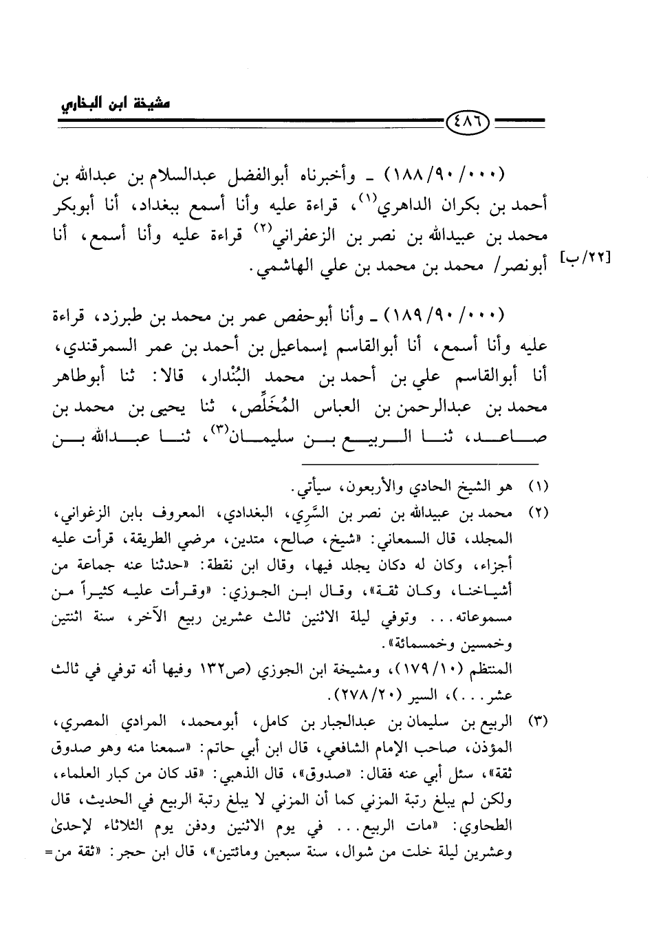 (000 / 90 / 188) - وَأَخْبَرَنَاهُ أَبُو الْفَضْلِ عَبْدُ السَّلَامِ بْنُ عَبْدِ اللَّهِ بْنِ أَحْمَدَ بْنِ بَكْرَانَ الدَّاهِرِيُّ، قِرَاءَةً عَلَيْهِ وَأَنَا أَسْمَعُ بِبَغْدَادَ، أَنَا أَبُو بَكْرٍ مُحَمَّدُ بْنُ عُبَيْدِ اللَّهِ بْنِ نَصْرِ بْنِ الزَّعْفَرَانِيِّ قِرَاءَةً عَلَيْهِ وَأَنَا أَسْمَعُ، أَنَا أَبُو نَصْرٍ / مُحَمَّدُ بْنُ مُحَمَّدِ بْنِ عَلِيٍّ الْهَاشِمِيُّ.