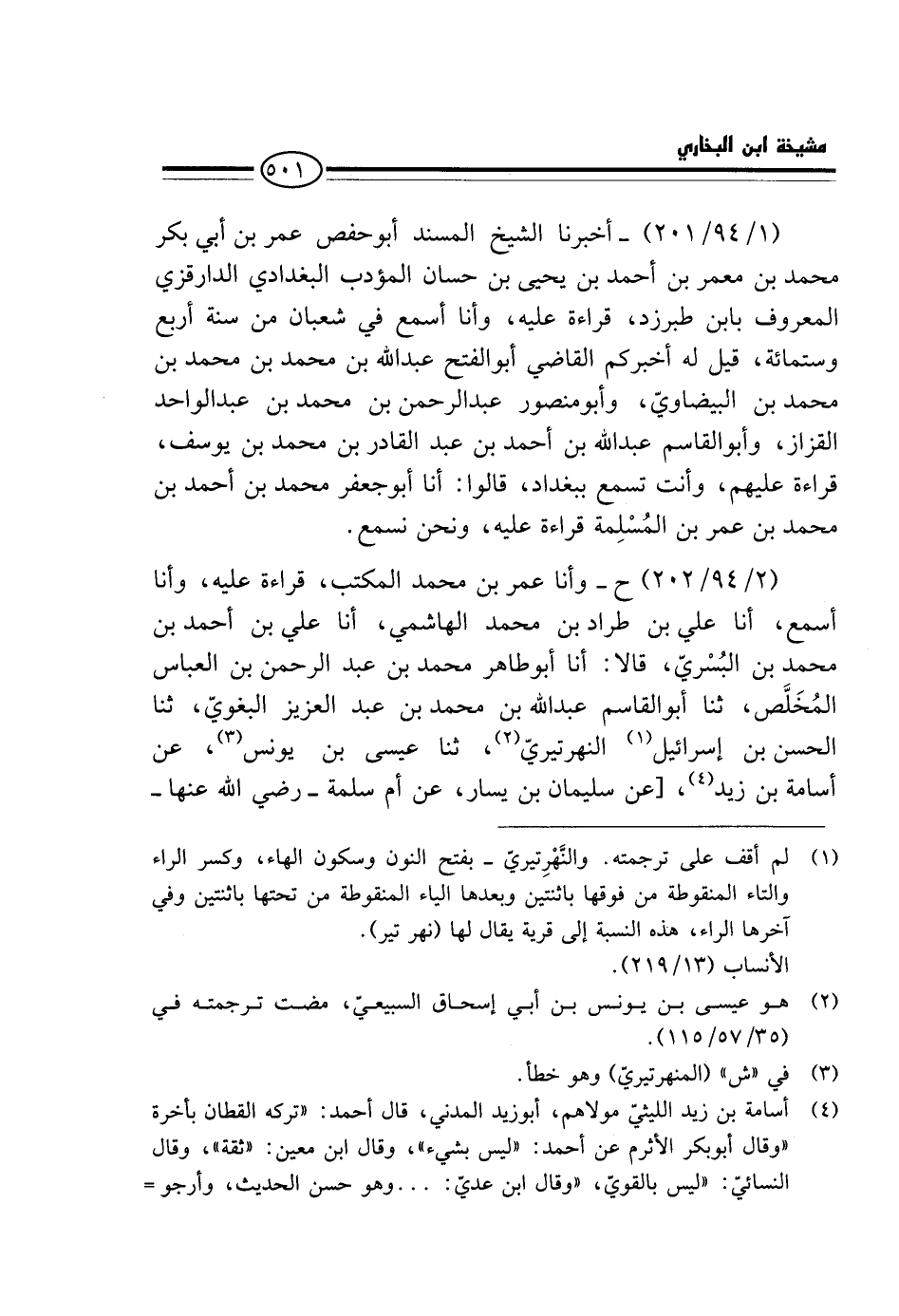 (1 / 94 / 201) - أَخْبَرَنَا الشَّيْخُ الْمُسْنَدُ أَبُو حَفْصٍ عُمَرُ بْنُ أَبِي بَكْرٍ مُحَمَّدِ بْنِ مَعْمَرِ بْنِ أَحْمَدَ بْنِ يَحْيَى بْنِ حَسَّانٍ الْمُؤَدِّبُ الْبَغْدَادِيُّ الدَّارَقَزِّيُّ الْمَعْرُوفُ بِابْنِ طَبَرْزَدَ، قِرَاءَةً عَلَيْهِ، وَأَنَا أَسْمَعُ فِي شعْبَان من سنة أَربع وسِتمِائَة، قِيلَ لَهُ أَخْبَرَكُمْ الْقَاضِي أَبُو الْفَتْح عَبْدُ اللَّهِ بْنُ مُحَمَّدِ بْنِ مُحَمَّدِ بْنِ مُحَمَّدِ بْنِ الْبَيْضَاوِيِّ، وَأَبُو مَنْصُورٍ عَبْدُ الرَّحْمَنِ بْنُ مُحَمَّدِ بْنِ عَبْدِ الْوَاحِدِ الْقَزَّازُ، وَأَبُو الْقَاسِمِ عَبْدُ اللَّهِ بْنُ أَحْمَدَ بْنِ عَبْدِ الْقَادِرِ بْنِ مُحَمَّدِ بْنِ يُوسُفَ، قِرَاءَةً عَلَيْهِمْ، وَأَنْتَ تَسْمَعُ بِبَغَدَادَ، قَالُوا: أَنَا أَبُو جَعْفَرٍ مُحَمَّدُ بْنُ أَحْمَدَ بْنِ مُحَمَّدِ بْنِ عُمَرَ بْنِ الْمُسْلِمَةِ قِرَاءَةً عَلَيْهِ، وَنَحْنُ نَسْمَعُ.