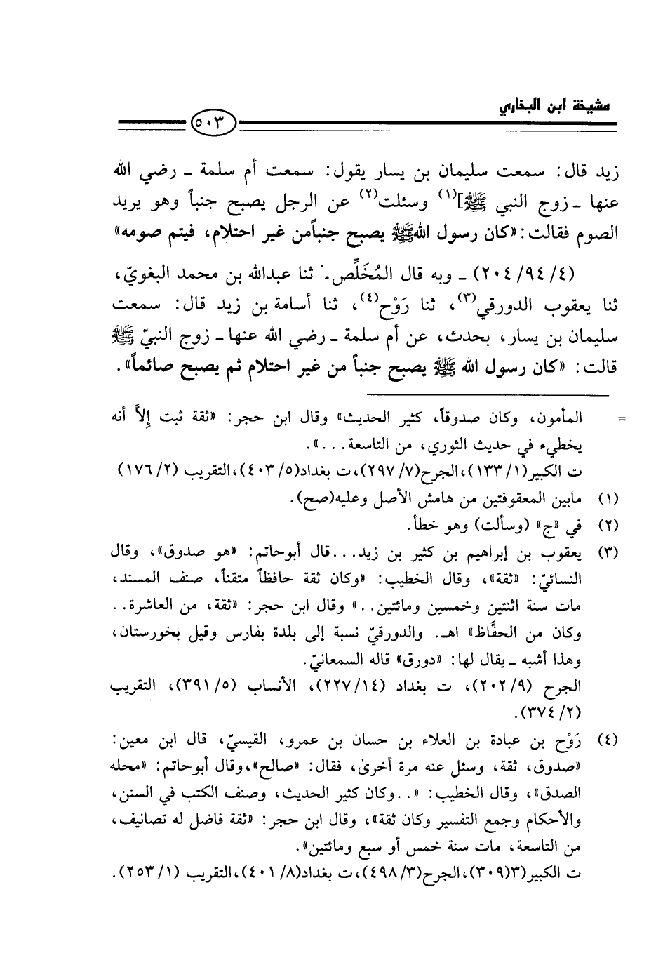 (4 / 94 / 204) - وَبِهِ قَالَ الْمُخَلِّصُ، ثَنَا عَبْدُ اللَّهِ بْنُ مُحَمَّدٍ الْبَغَوِيُّ، ثَنَا يَعْقُوبُ الدَّوْرَقِيُّ، ثَنَا رَوْح، ثَنَا أُسَامَةُ بْنُ زَيْدٍ قَالَ: سَمِعْتُ سُلَيْمَانَ بن يسَار، بِحَدَث، عَنْ أُمِّ سَلَمَةَ - رَضِيَ اللَّهُ عَنْهَا - زَوْجِ النَّبِي - صَلَّى اللَّهُ عَلَيْهِ وَسَلَّم َ - قَالَت: " كَانَ رَسُول الله - صَلَّى اللَّهُ عَلَيْهِ وَسَلَّم َ - يُصْبِح جُنُبًا مِنْ غَيْرِ احْتِلَامٍ ثُمَّ يُصْبِح صَائِما ".