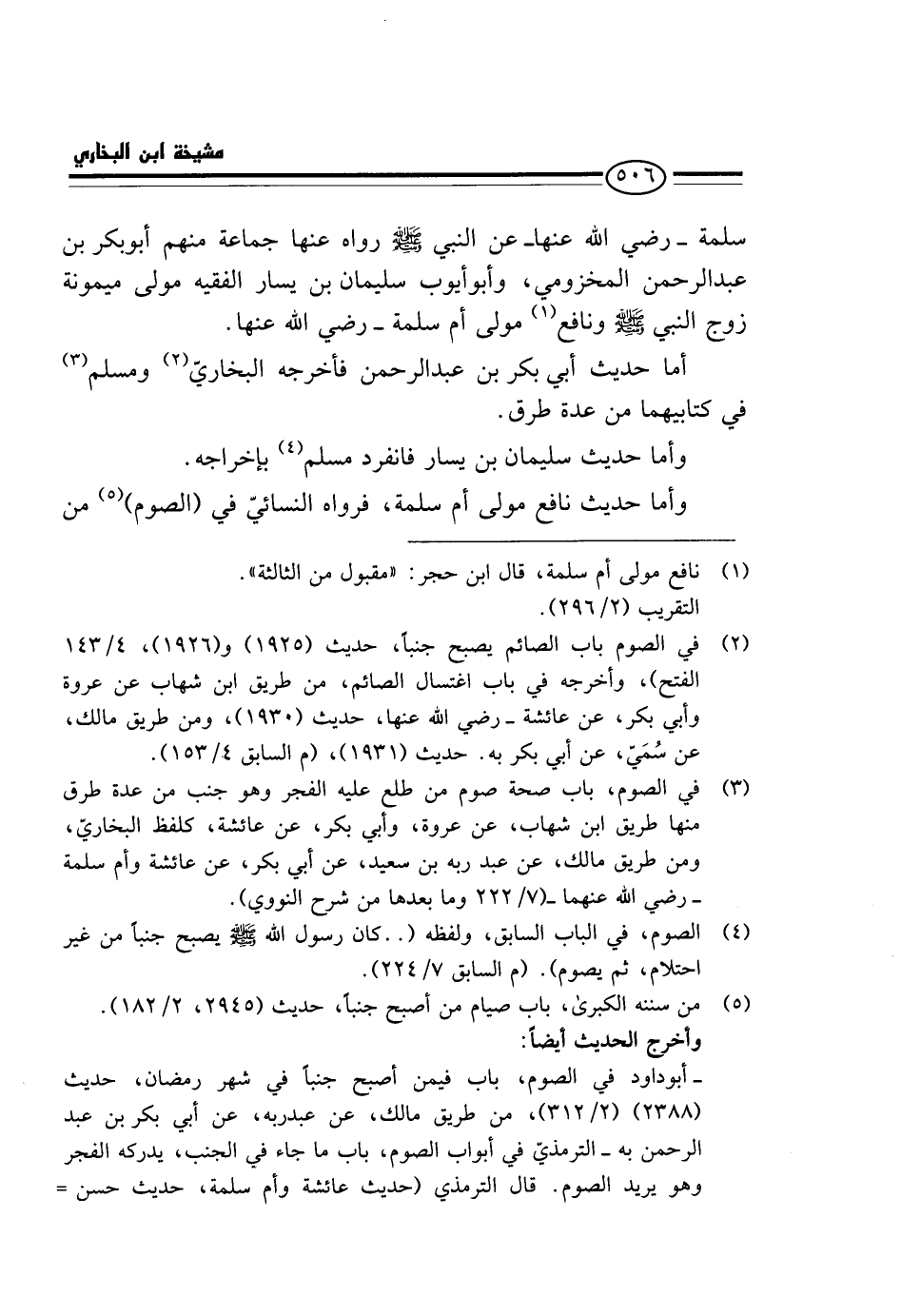 وَأَمَا حَدِيثُ سُلَيْمَانَ بْنِ يَسَارٍ فَانْفَرَدَ مُسْلِمٌ بِإِخْرَاجِهِ. " وَأَمَا حَدِيثُ نَافِعٍ مَوْلَى أُمِّ سَلَمَةَ، فَرَوَاهُ النَّسَائِيُّ فِي (الصَّوْمِ) مِنْ